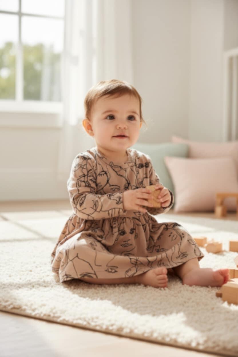 Mini mize pudderfarvet langærmet body-kjole str. 68 med sort tryk af tegnede ansigter, og med en lille brystlomme.