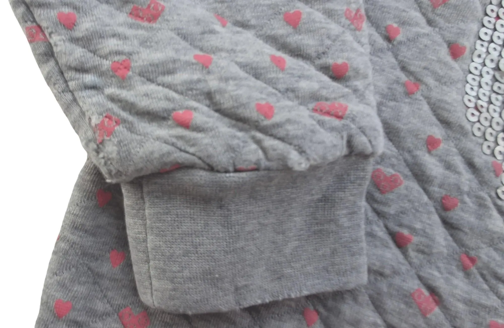 Lego wear lysegrå langærmet sweatshirt str. 104 med pink små hjerter over det hele og med sølvgrå pailetter på forsiden og rib kanter. Obs slid på ærmekanterne over ribben, se billede.