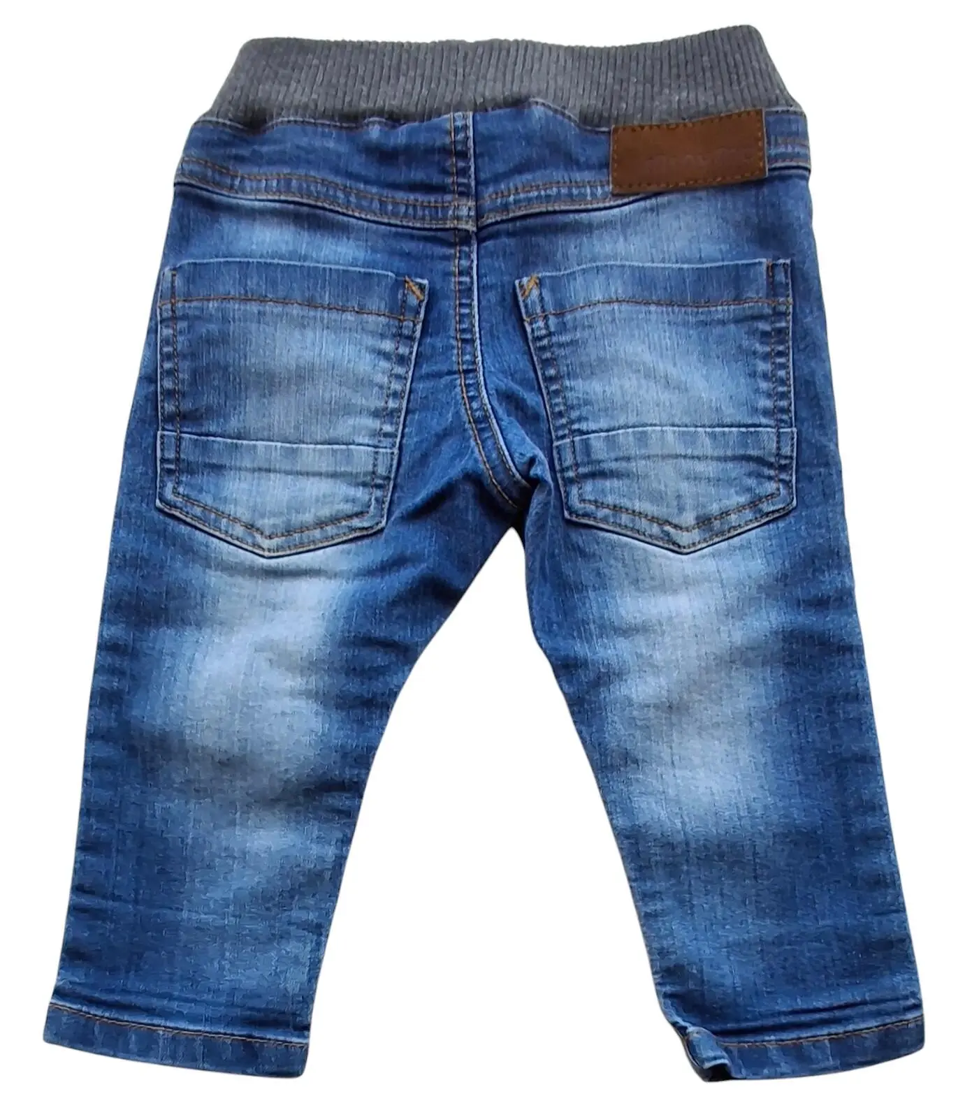 Minymo fine blå denim bukser str. 74 med to lommer foran og bagpå og med en bred grå rib-elastik i taljen.
