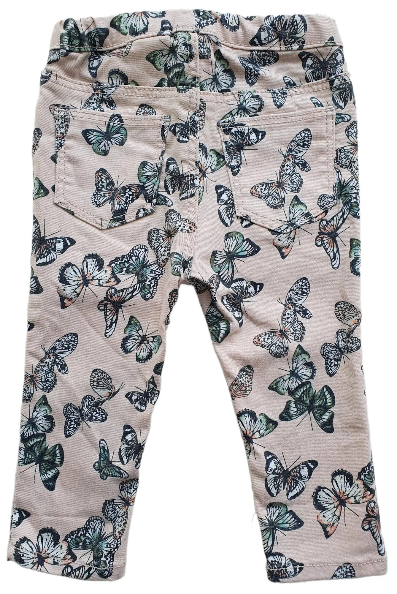 H&M rosa jeggings str. 74 med tryk af sommerfugle over det hele, og med to baglommer og justerbar elastik i taljen.