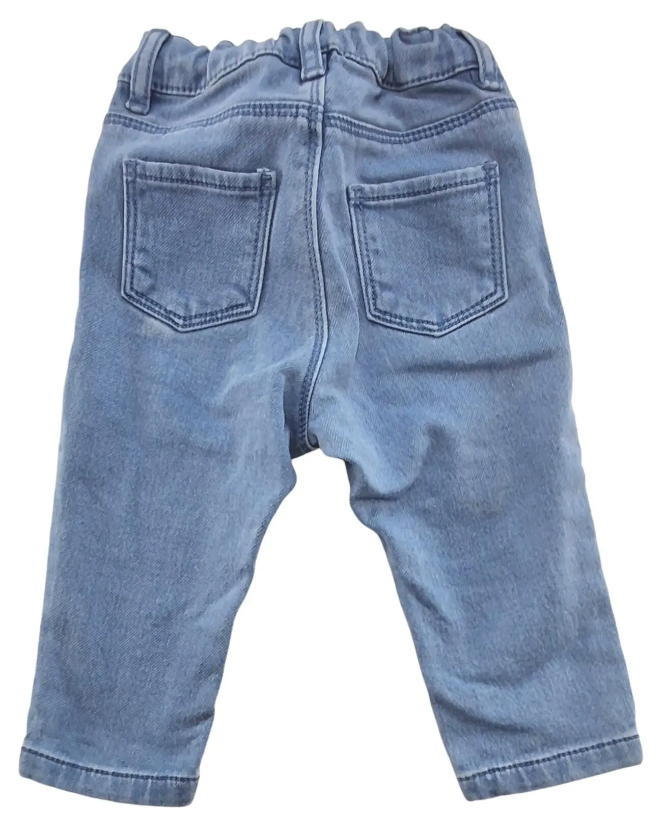 VRS Anna lyse denimbukser str. 74 med fine blonder på det ene bukseben, lommer både foran og bagpå og med hægte og justerbar elastik i taljen.
