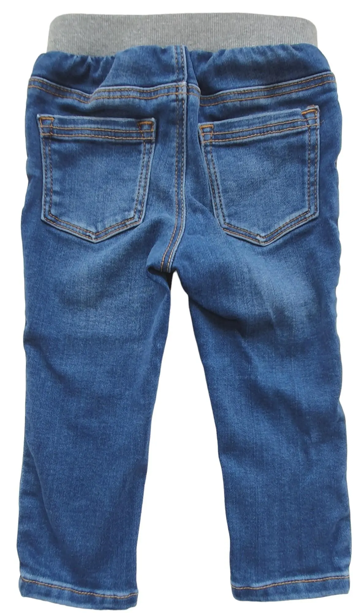 H&M blå denim bukser str. 86 i model "slim fit" med to baglommer, og med lysegrå rib-elastik i taljen.