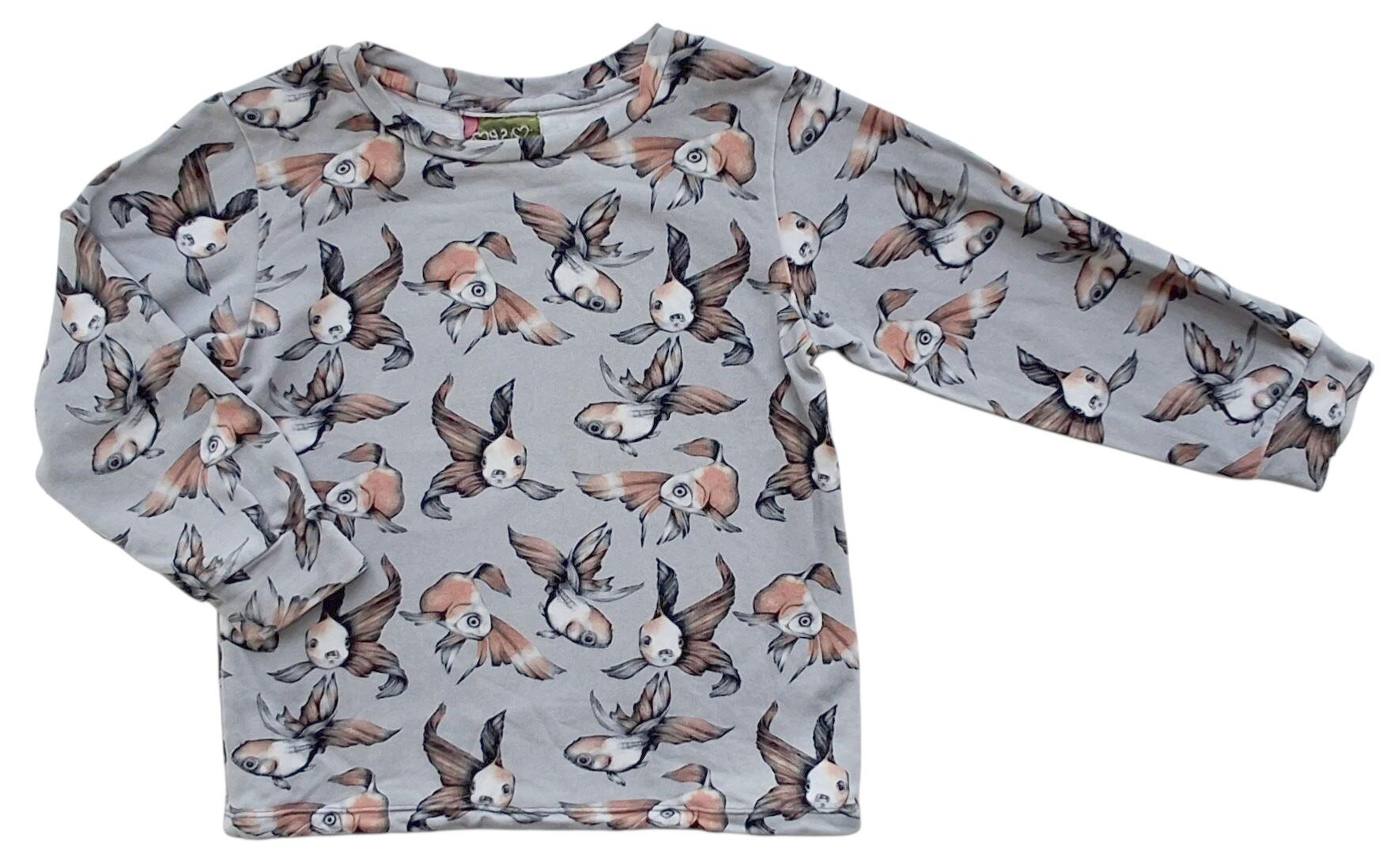 Hjemmesyet lysegrå langærmet bluse str. 98-104 med tryk af slørhale fisk og med en rund halsudskæring.