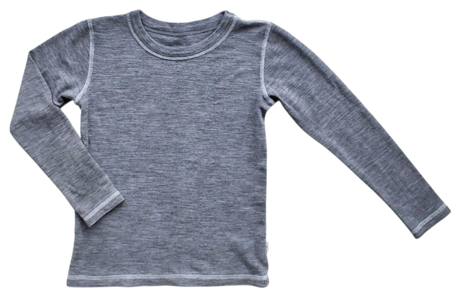 808 grå langærmet uld bluse str. 122-128 med en rund halsudskæring. 100% merinould.