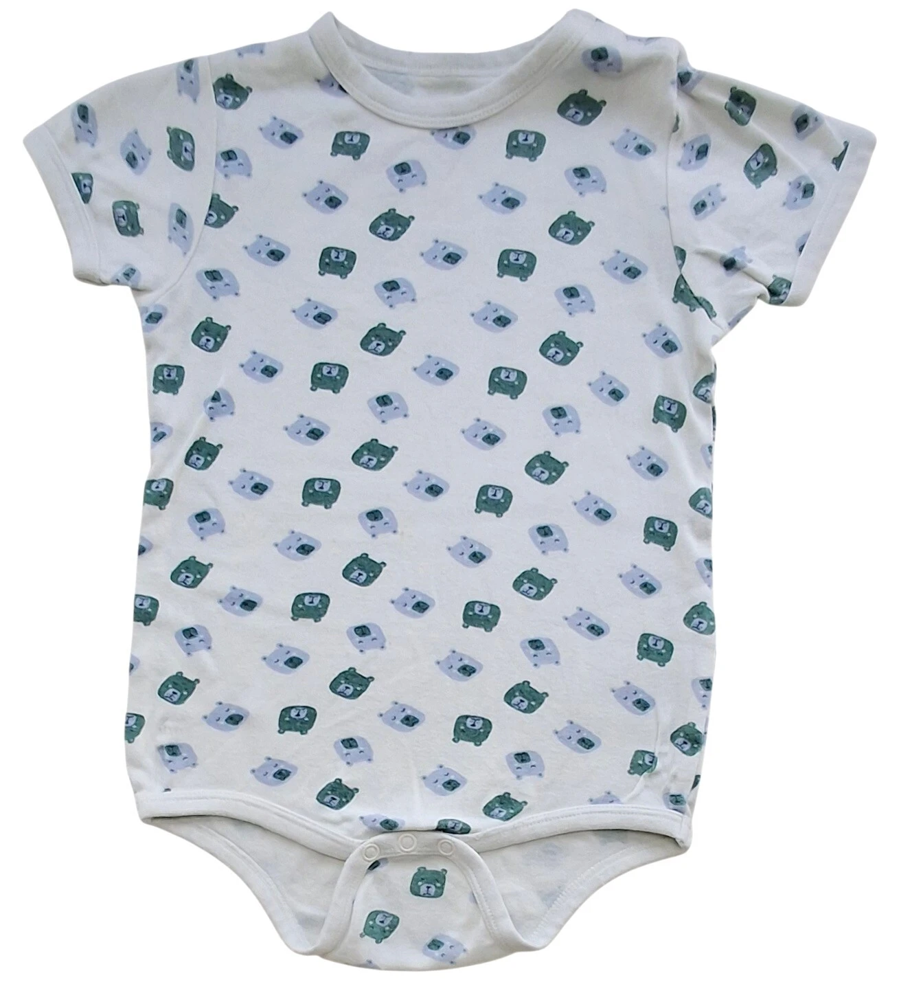 Care råhvid kortærmet body str. 98 i en kraftig kvalitet og med tryk af bamse hoveder. 100% bomuld. Obs der er et par meget svage småpletter på forsiden, se billede.
