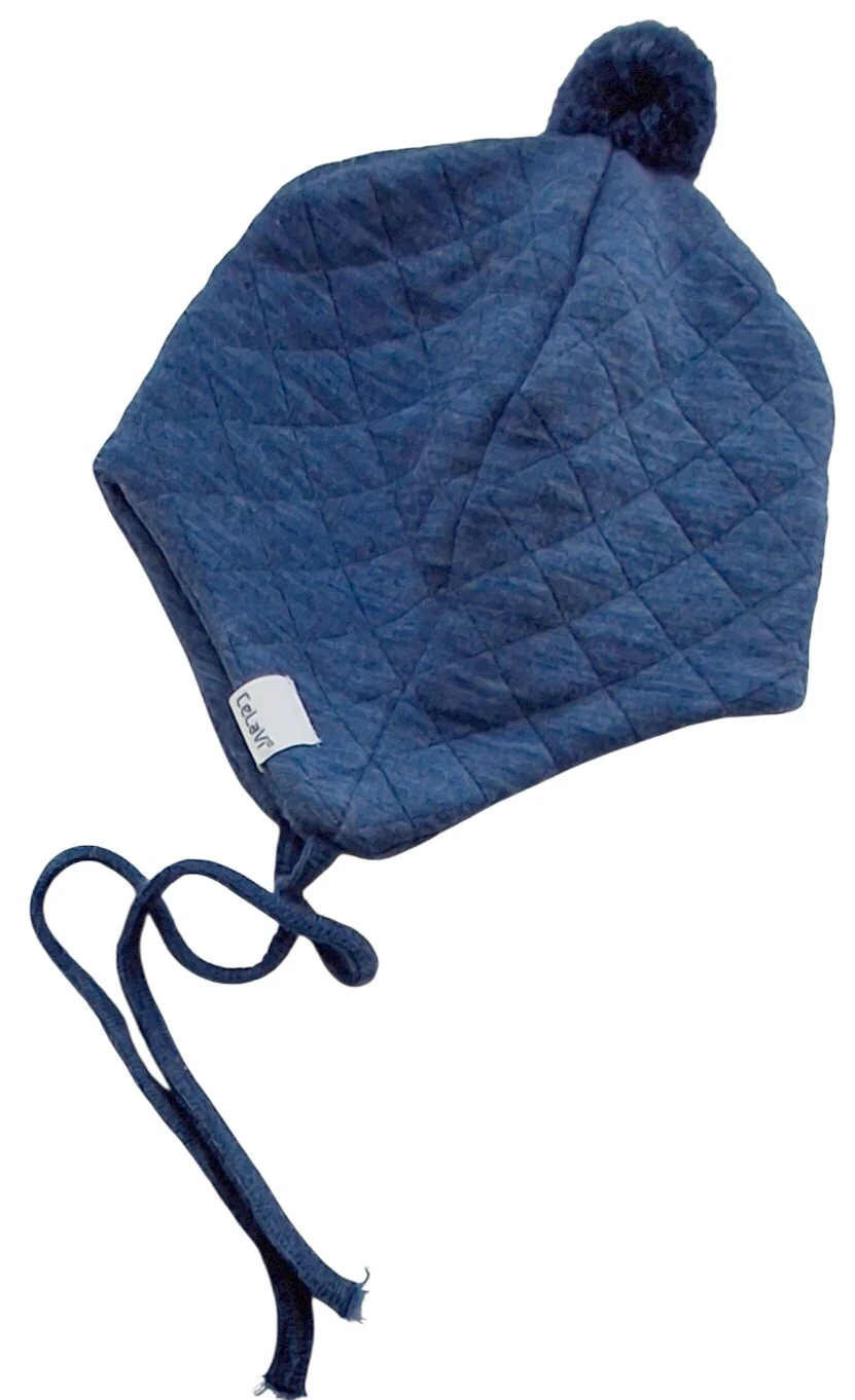 Celavi gråblå blød uld hue str. 0-3 mdr (ca 40-41 cm) med to lag, øreklapper, kvast på toppen og med bindebånd. 83% uld og 17% tencel.