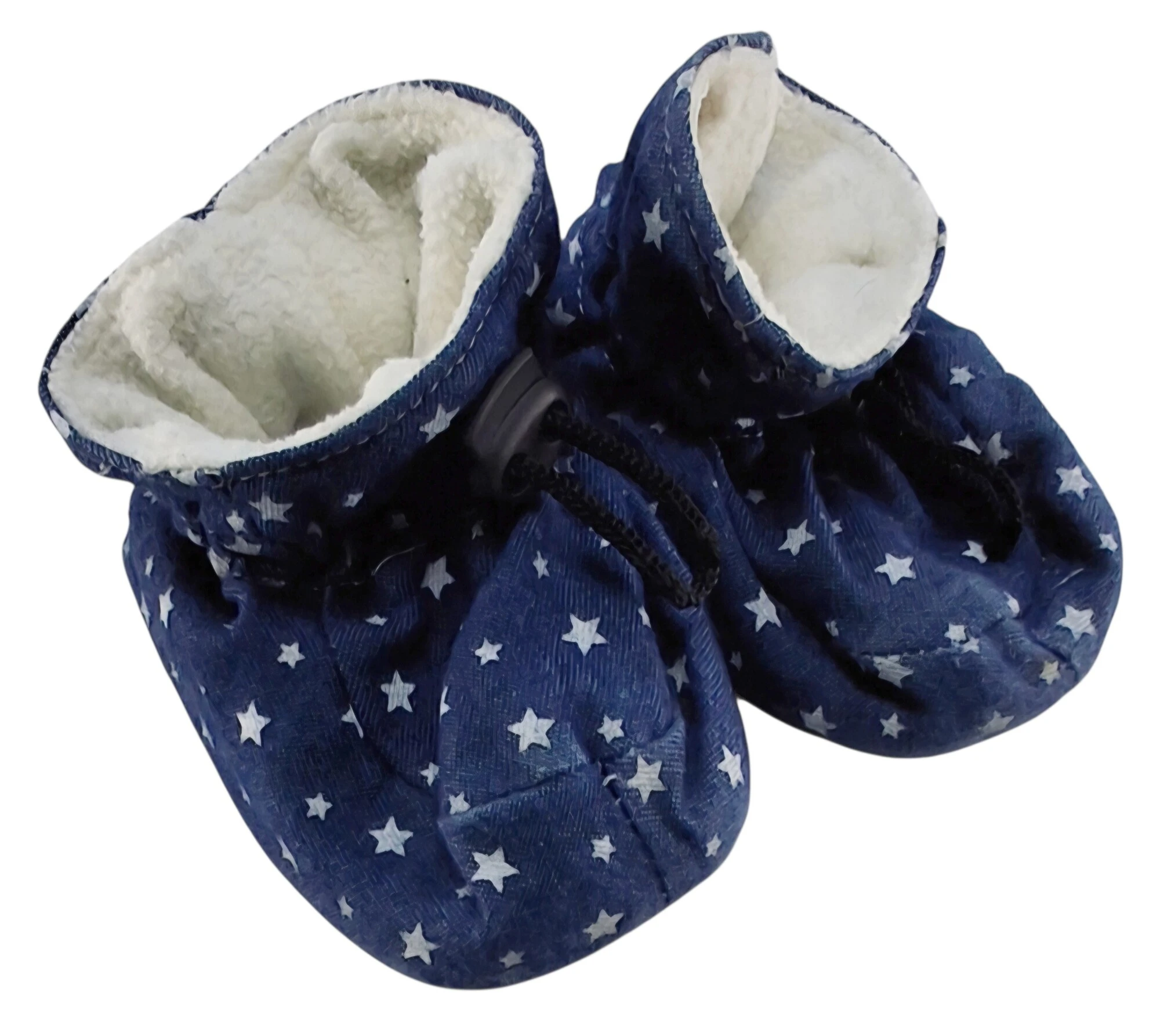 Denimlook blå hjemmefutter str. 20-21 med tryk af stjerner, varmt fleecefor og med elastik og snor omkring anklen.