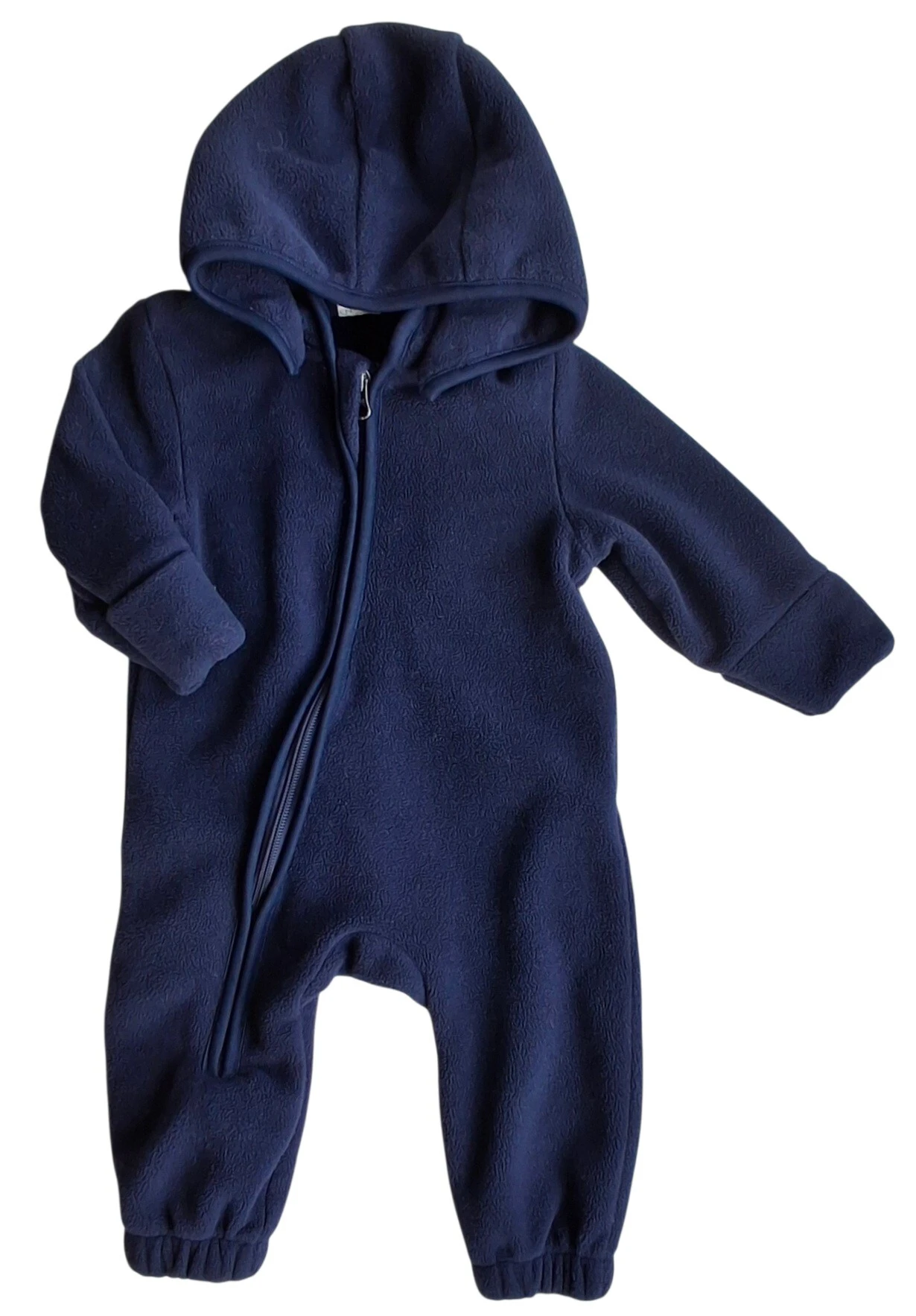 EnFant mørkeblå fleece køredragt str. 68 i en god kvalitet med hætte, ombuk ved hænderne, elastik ved benene og med en lynlås fra hals til knæ.