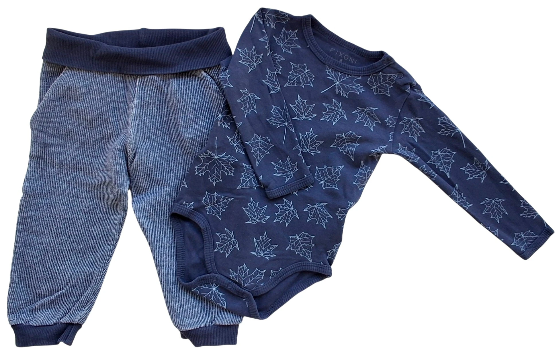 Fixoni stribede bukser og mørkeblå body str. 74. Bukserne er i en kraftig kvalitet med skrålommer og baglommer, og med rib i benene og taljen. Bodyen er langærmet og med tryk af blade og med to trykknapper på skulderen.