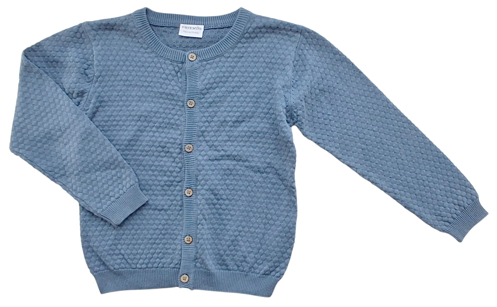 Friends blågrå langærmet finstrikket trøje str. 116 i et fin boblemønster og med knapper ned foran. 100% bomuld.