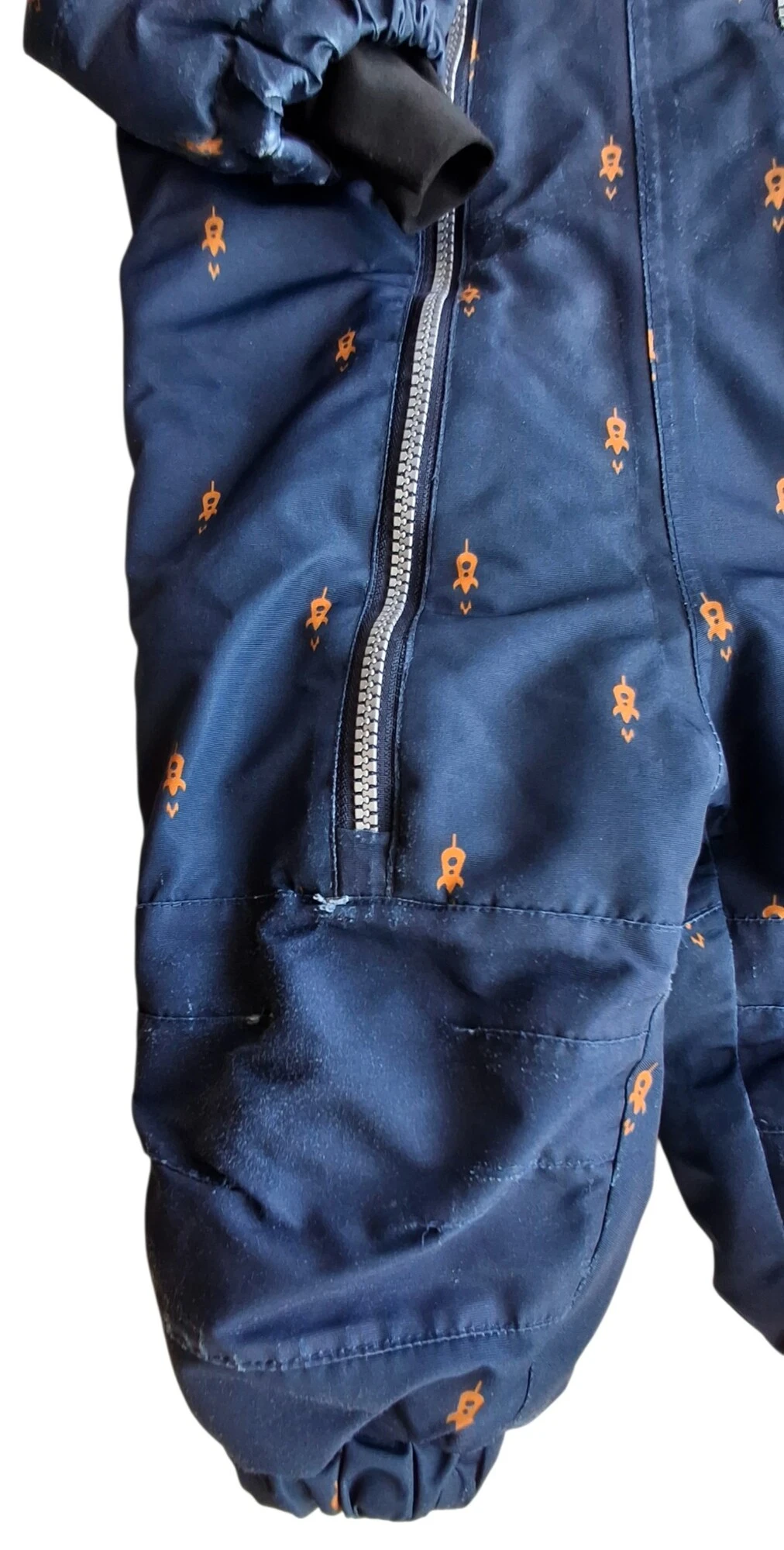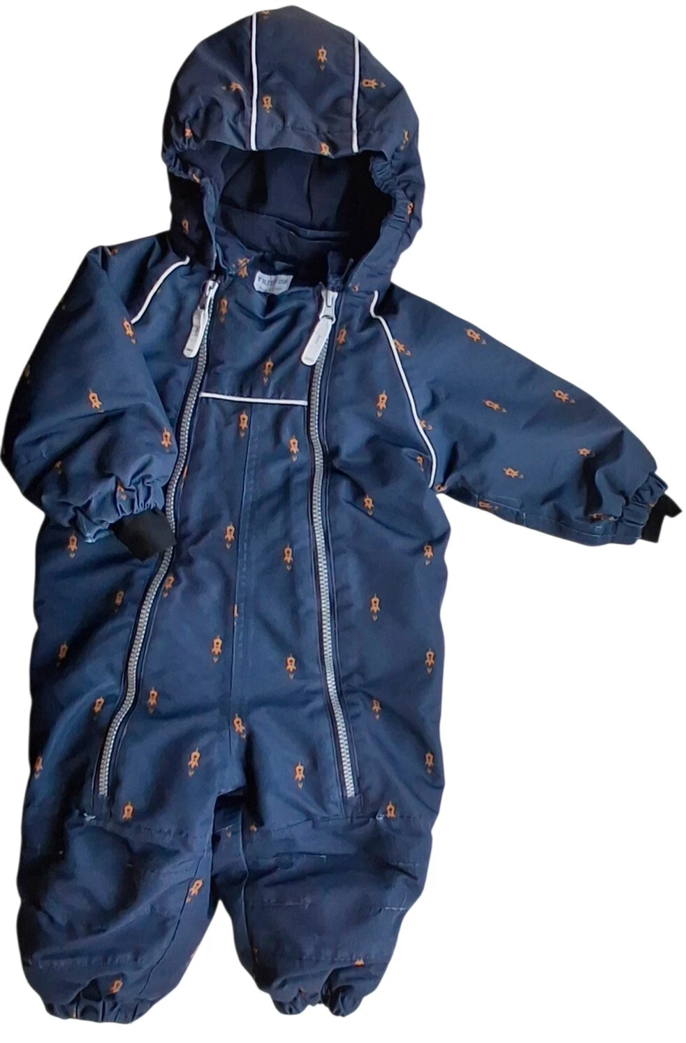 Friends mørkeblå langærmet flyverdragt str. 74 med tryk af små raketter, hætte, fodstropper og med to lynlåse ned foran. Obs lidt slid på benene fra knæene og ned og i ærmekanterne, se billede.