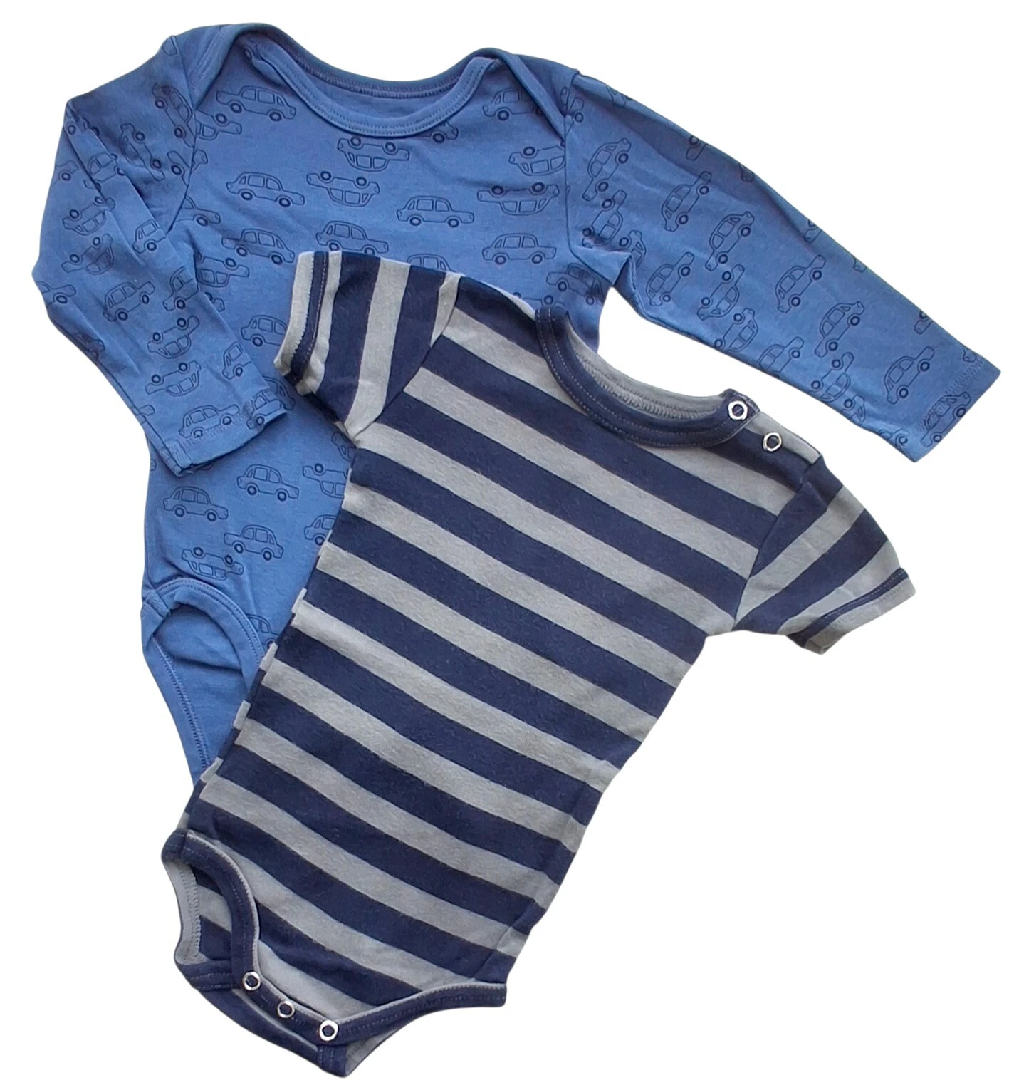 Friends stribet body og H&M blå body str. 74. Den stribede body har korte ærmer og to trykknapper på skulderen, og den blå har lange ærmer og tryk af biler over det hele.