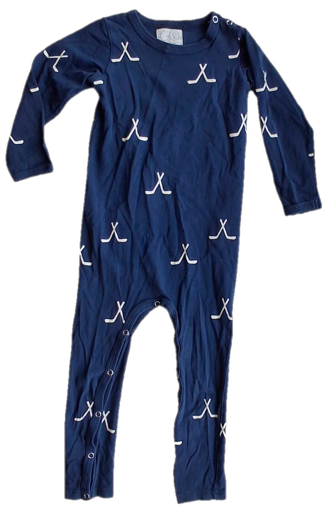 Gro mørkeblå langærmet heldragt str. 92 med hvidt tryk over det hele og med to trykknapper på skulderen. 95% bomuld, 5% elastane.