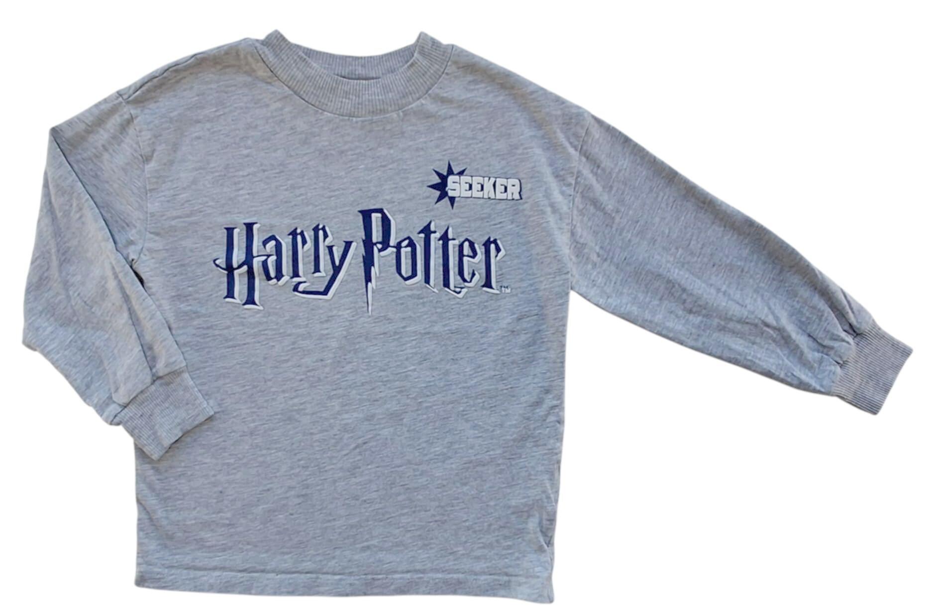 H&M langærmet lysegrå bluse str. 98-104 i en tynd kvalitet med rib kanter i ærmerne og halsen, og med et fint Harry Potter tryk på forsiden.