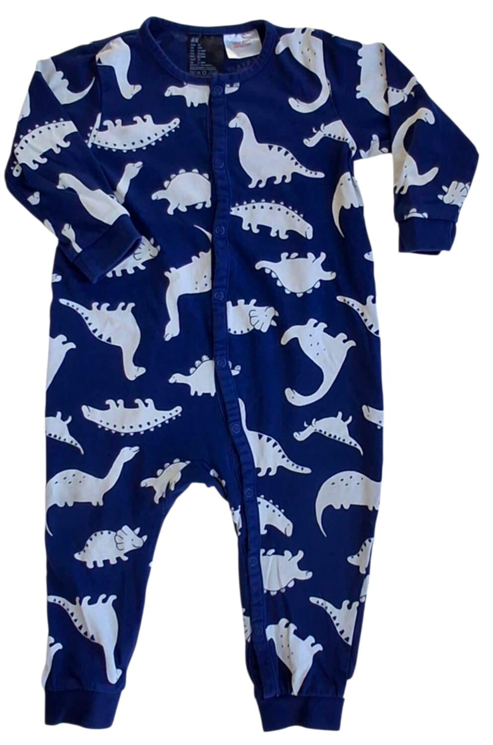 H&M mørkeblå langærmet heldragt str. 86 med beige tryk af dinosaurer og med trykknapper fra hals til fod.