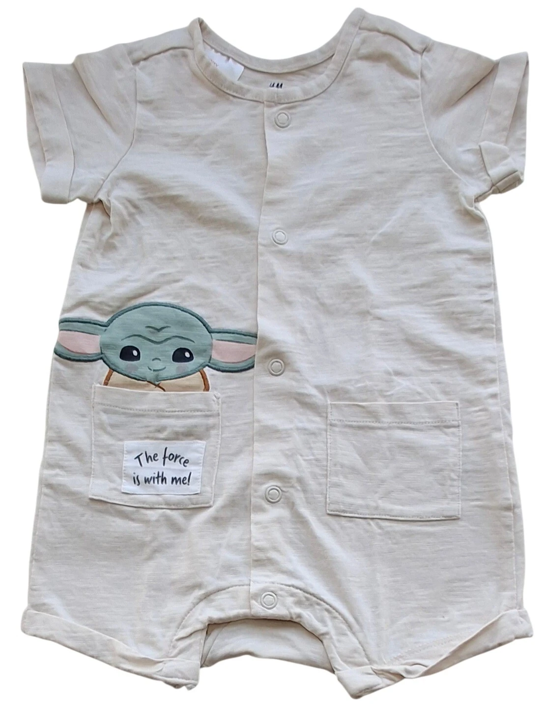 H&M råhvid starwars kortærmet heldragt str. 62 med korte ben, to lommer på forsiden, fin applikation på forsiden og trykknapper fra hals til benet.