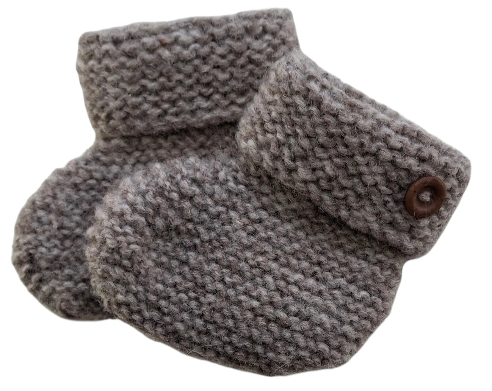 Hjemmestrikkede lysebrune uld futter str. 0-6 mdr (ca 10 cm) med en ombuk på kanten og en dekorativ knap.