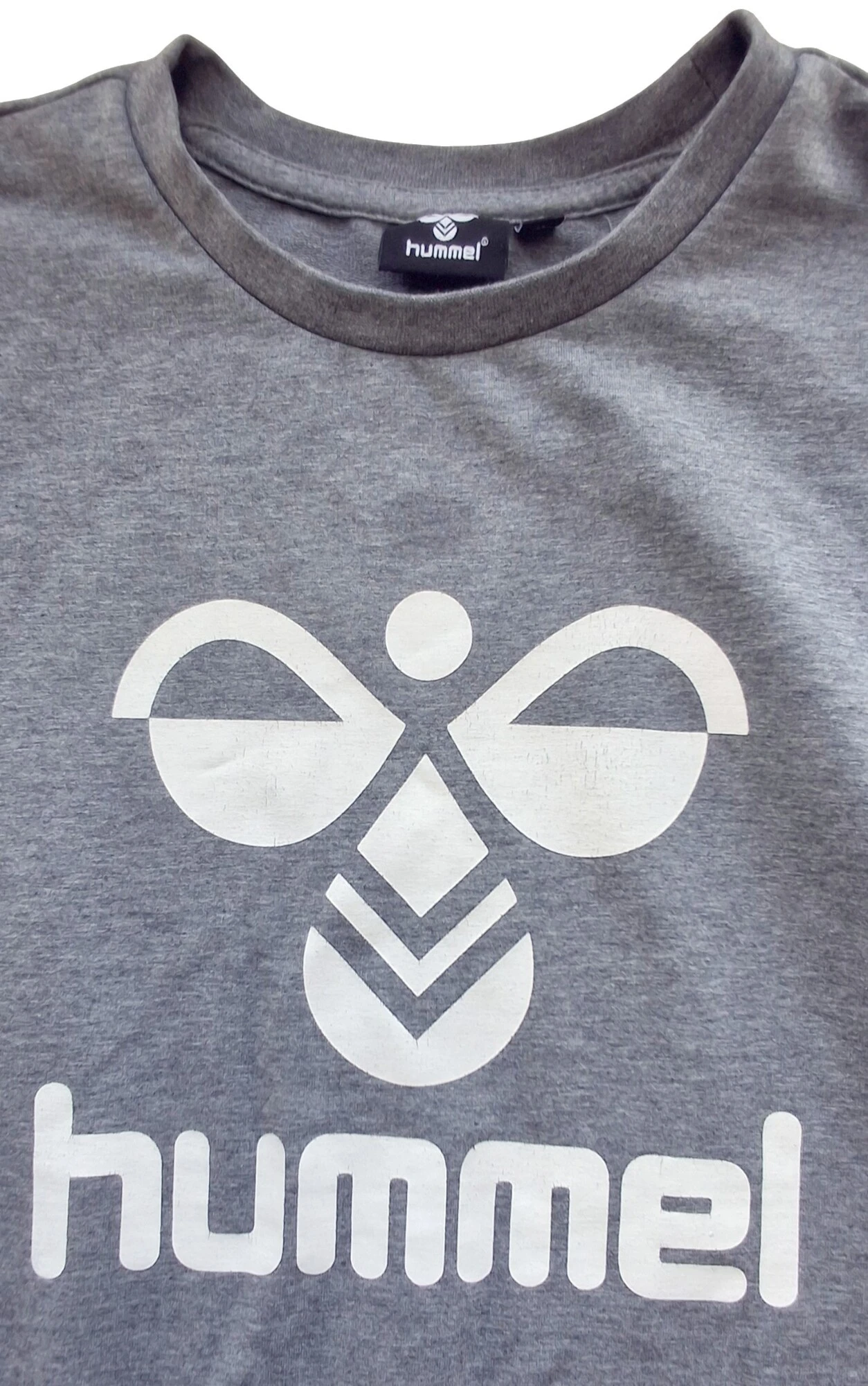 Hummel grå langærmet sweatshirt str. 152 med et stort hvidt logo tryk på forsiden og med rib kanter. Obs der er en plet over logoet, se billede.
