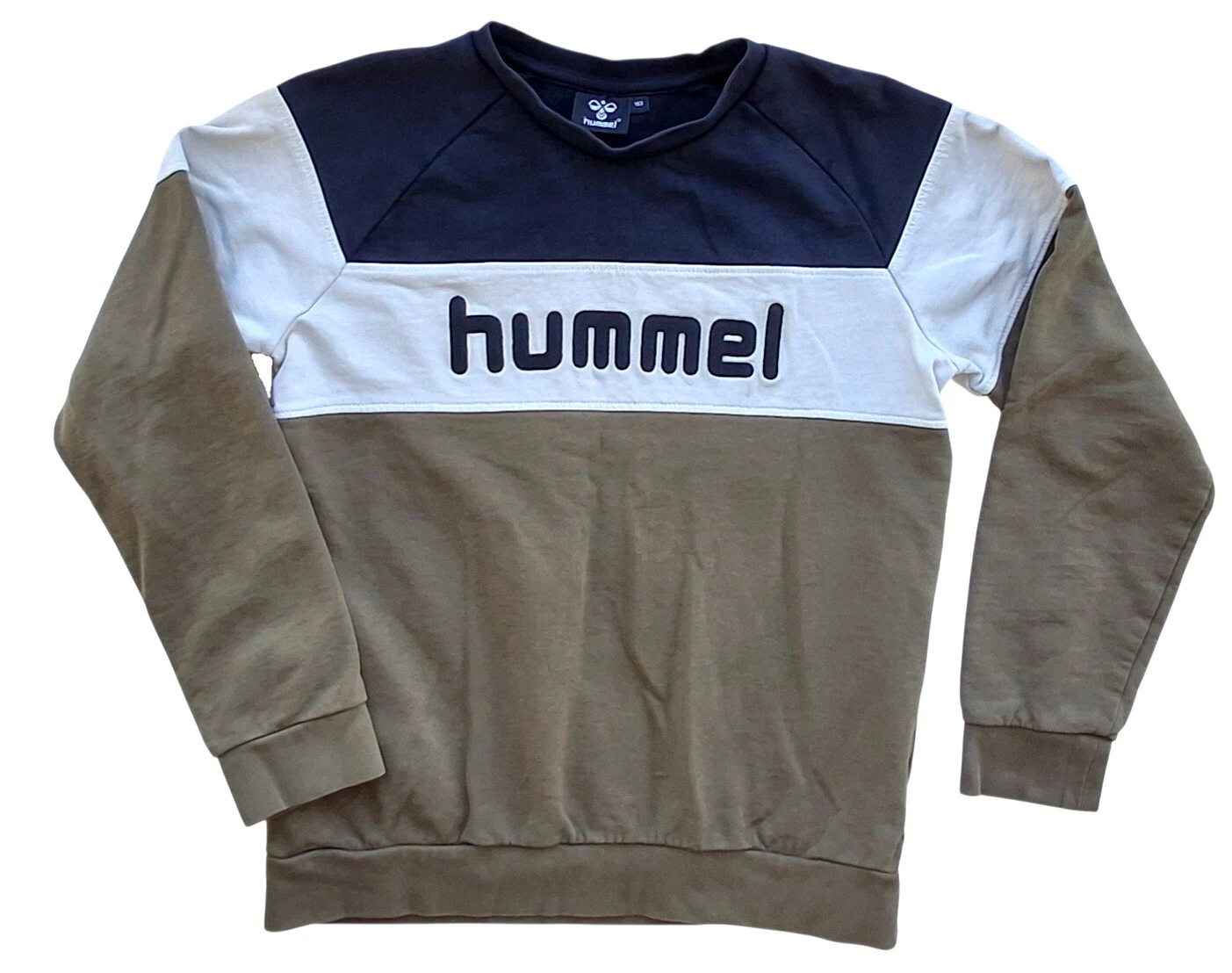 Hummel trefarvet langærmet sweatshirt str. 152 med et Hummel logo på forsiden og med ribkanter i ærmer, hals og nederst. 100% bomuld.