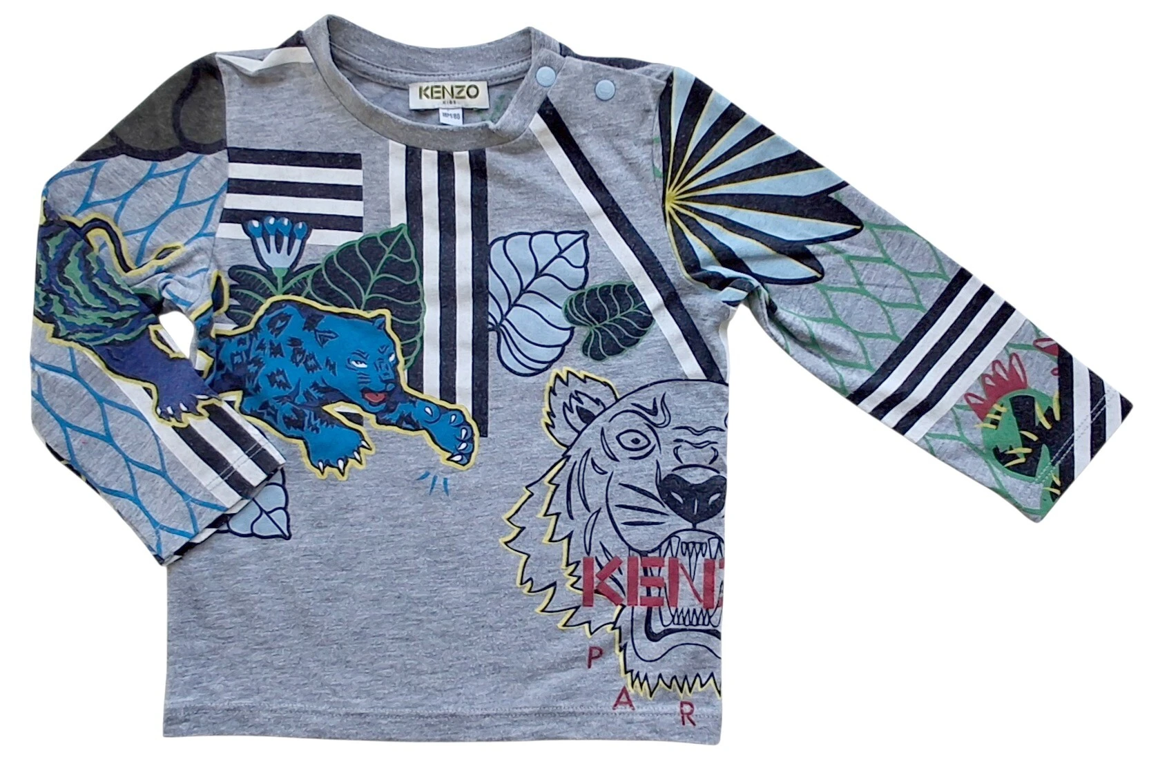 Kenzo lysegrå langærmet bluse str. 80 med tryk på både ærmer og forsiden og bagsiden, og med to trykknapper på den ene skulder. Obs lidt vaskefnuller.