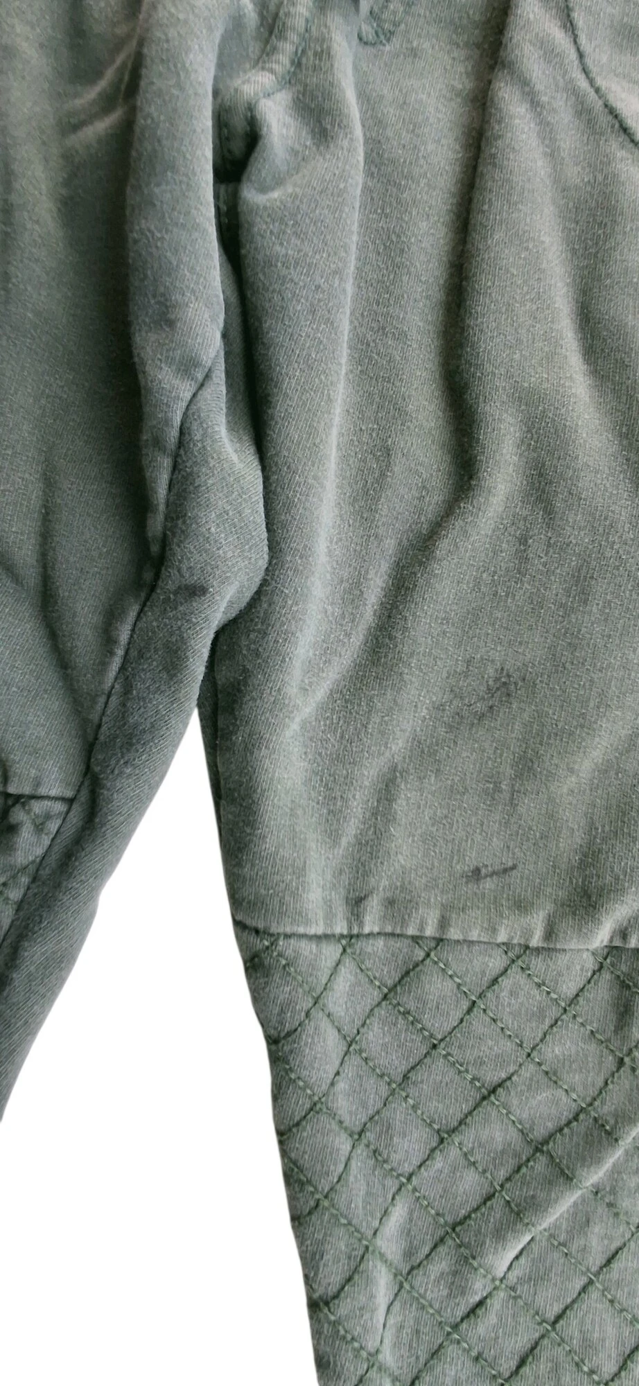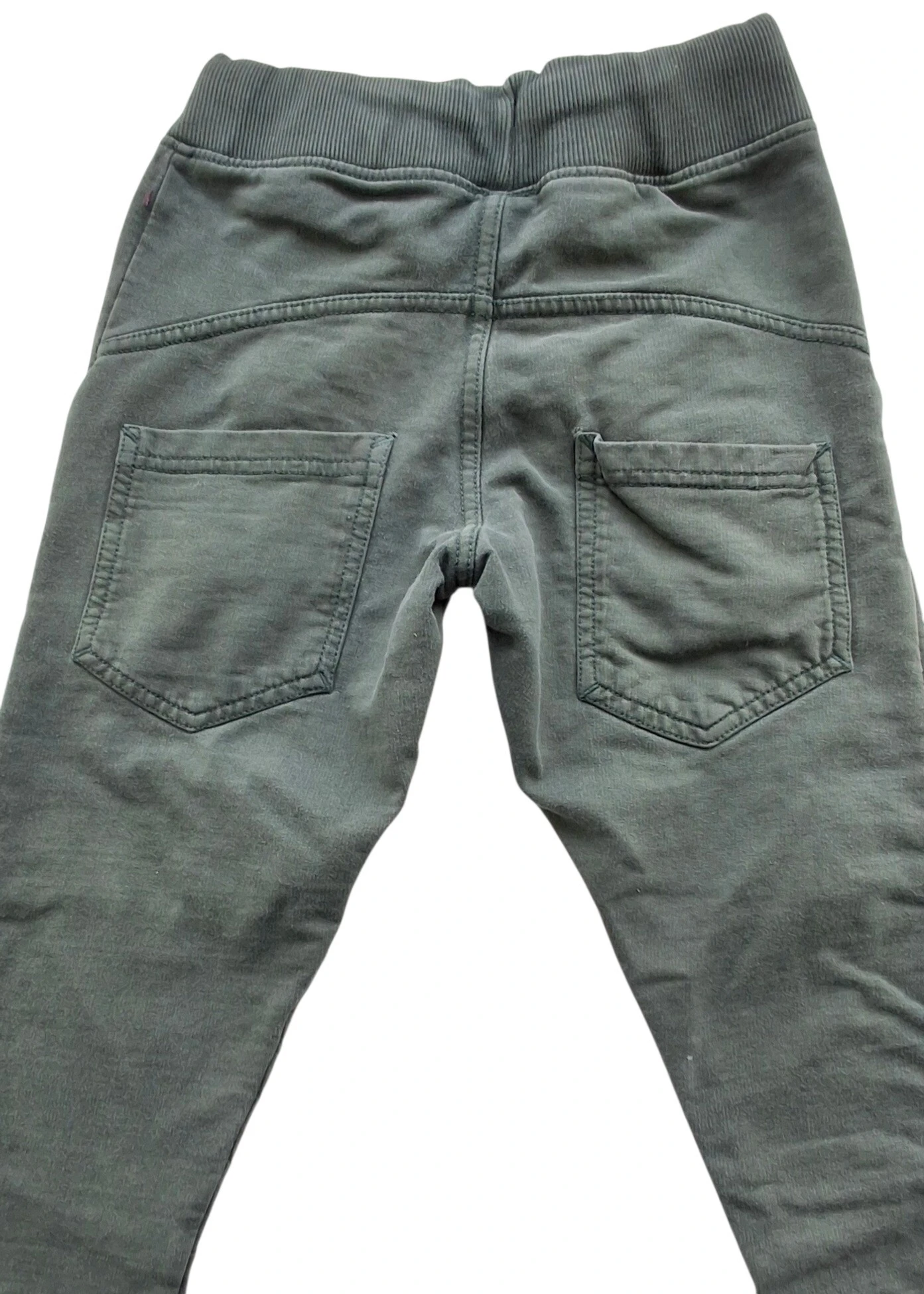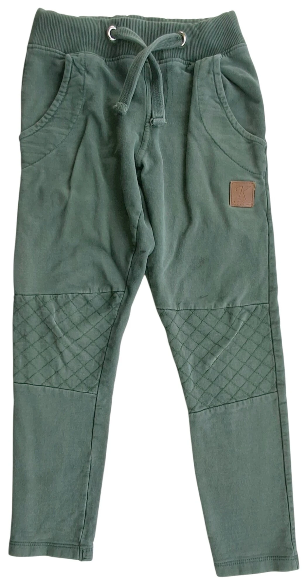 Krymmel mørkegrønne sweat bukser str. 122 med lommer foran og bagpå og med elastik og bindebånd i taljen. Obs der er noget sort maling på benene, se billede.