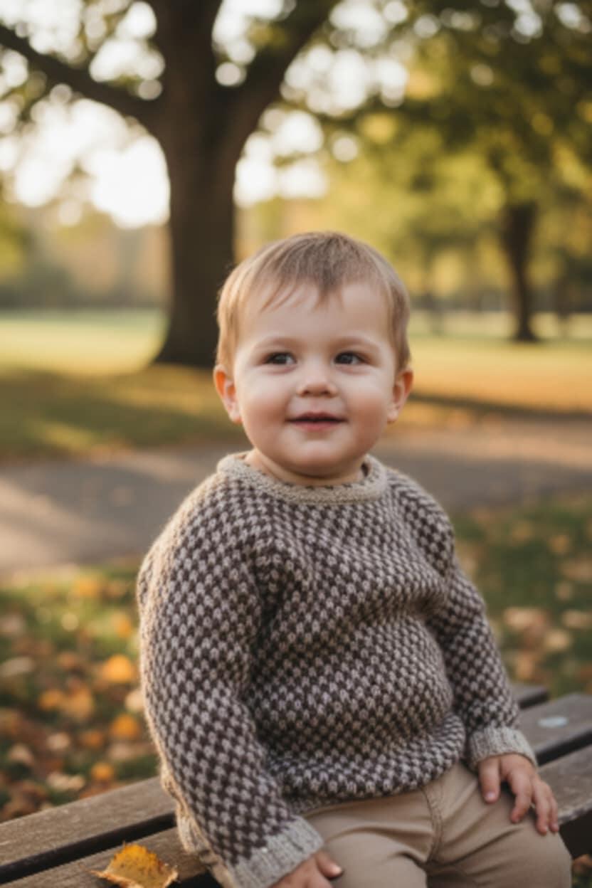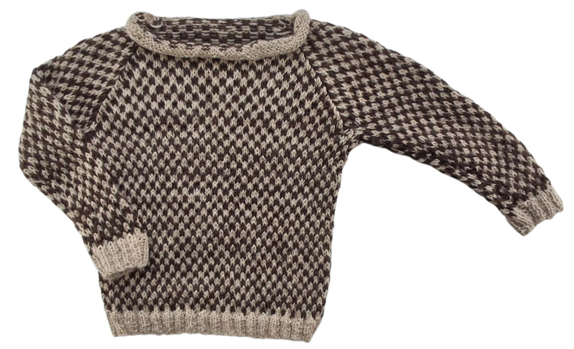 Lækker blød brunmønstret uldstriktrøje str. 92 med lange ærmer, beige rib kanter og med en rullekant i halsudskæringen. OBS på AI billedet er halsen ikke helt som på trøjen.