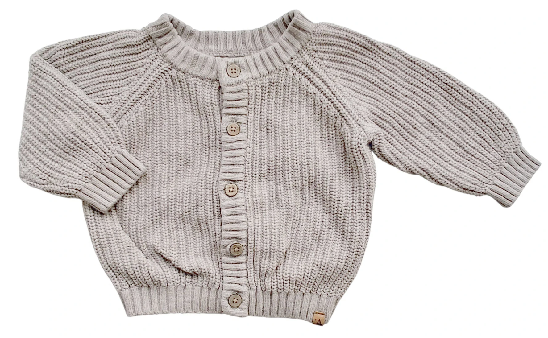 Lil'Atelier lys sandfarvet striktrøje str. 68 med lange ærmer, rib kanter og med knapper ned foran. 100% bomuld.