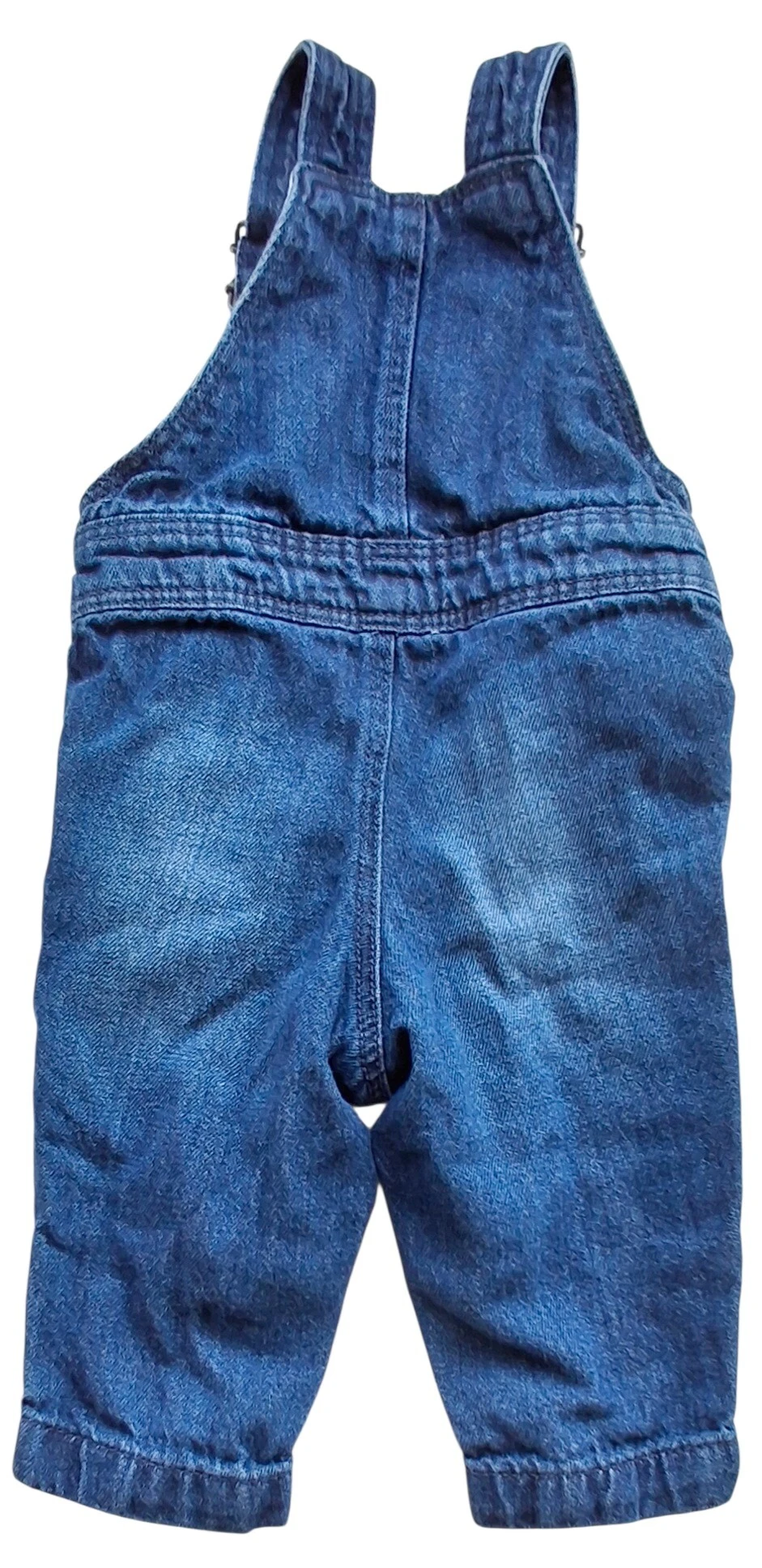 Lupilu blå denim overall's str. 68 med skrålommer foran, lomme med broderi på klappen og med seler over skuldrene.