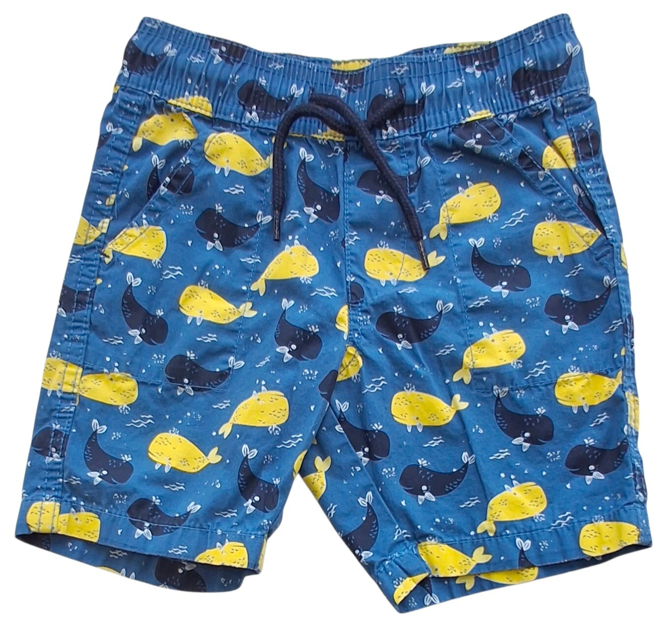 Lupilu petroleumsblå shorts str. 98-104 med tryk af hvaler, skrålommer, en baglomme og bred elastik i taljen.