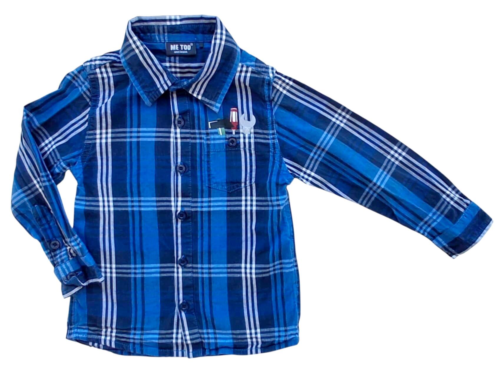 Me Too blåternet langærmet skjorte str. 86 med en brystlomme med tryk af værktøj der stikker op af lommen, krave og knapper ned foran.