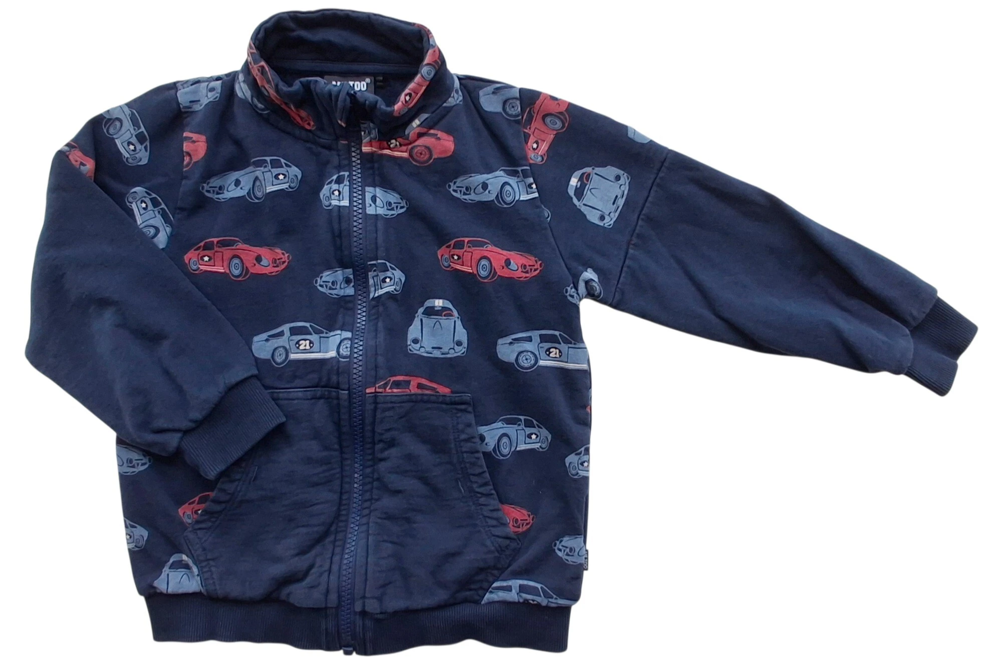 Me Too mørkeblå langærmet sweatshirt str. 104 med tryk af biler over det hele, lommer på forsiden og med en lynlås ned foran. 100% bomuld.