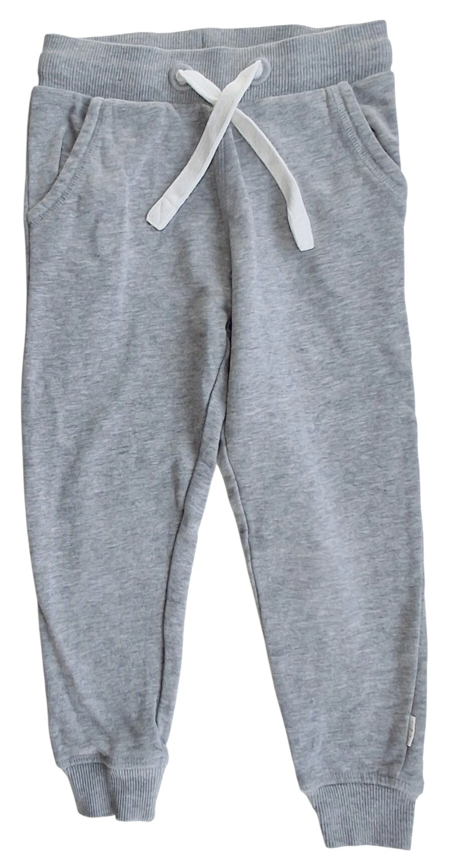 Minymo lysegrå tykke sweat bukser str. 104 med rib i benene, skrålommer og bred rib-elastik i taljen.