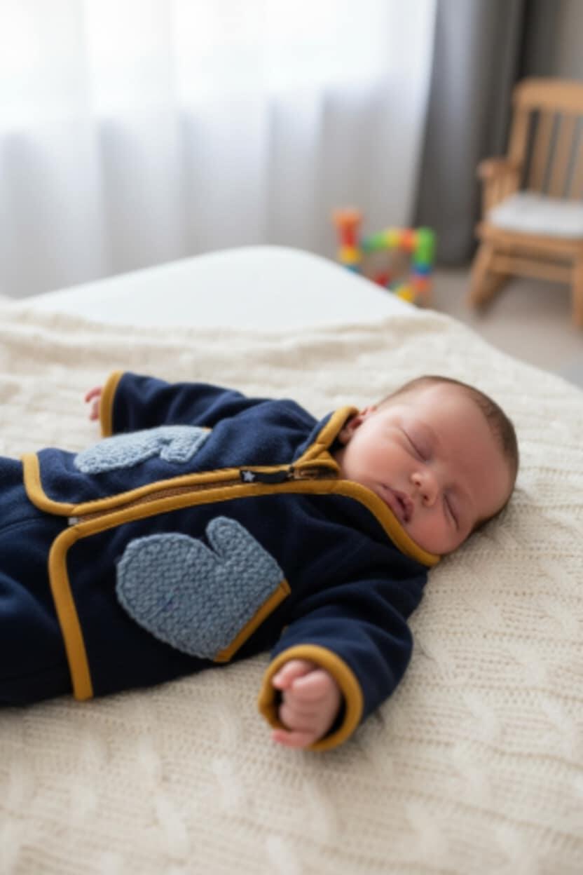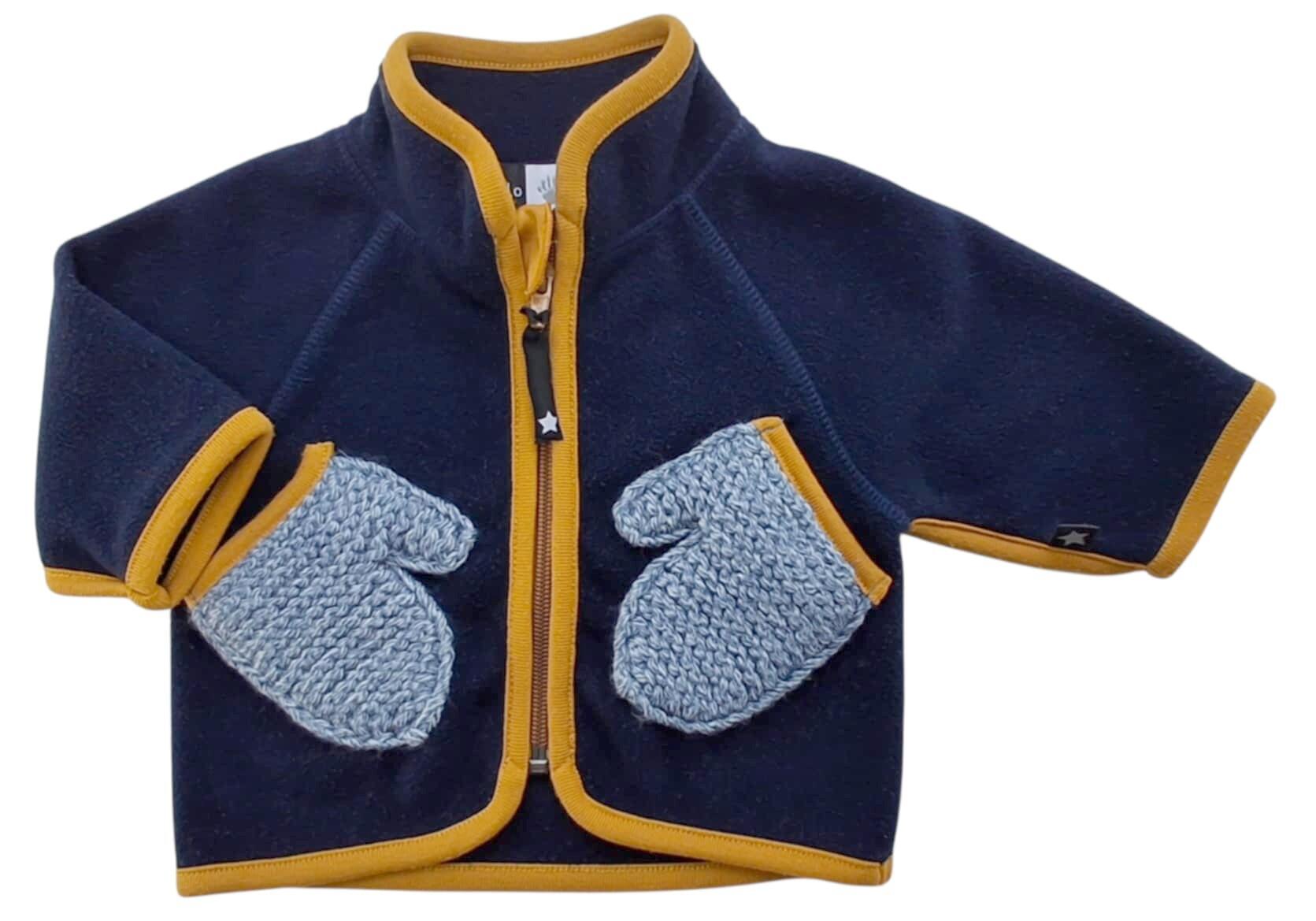 Molo mørkeblå fleecetrøje str. 56 med lange ærmer, strikkede lommer og karrybrune kanter.