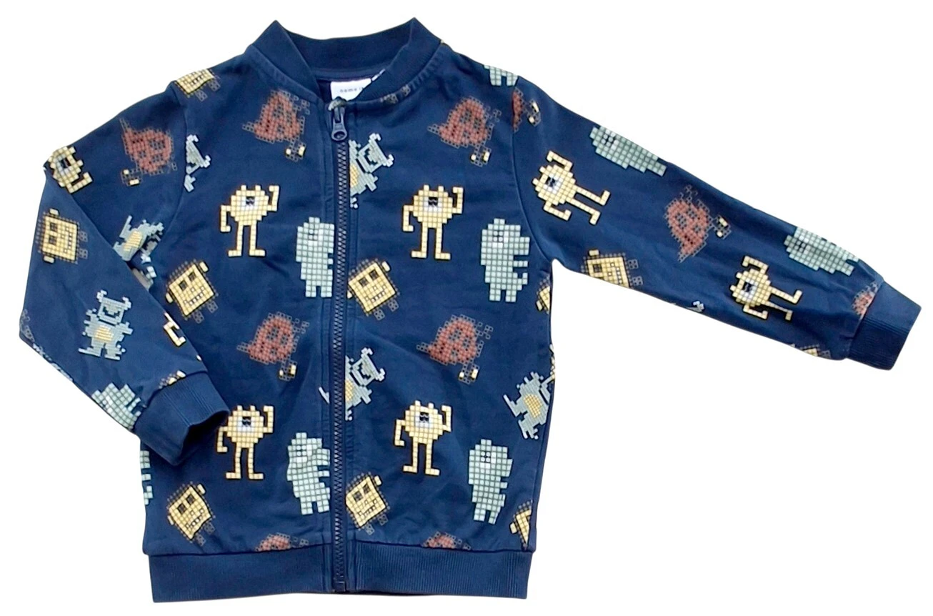 Name it blågrå langærmet cardigan str. 98 med et farverigt tryk, rib kanter og med en lynlås ned foran.
