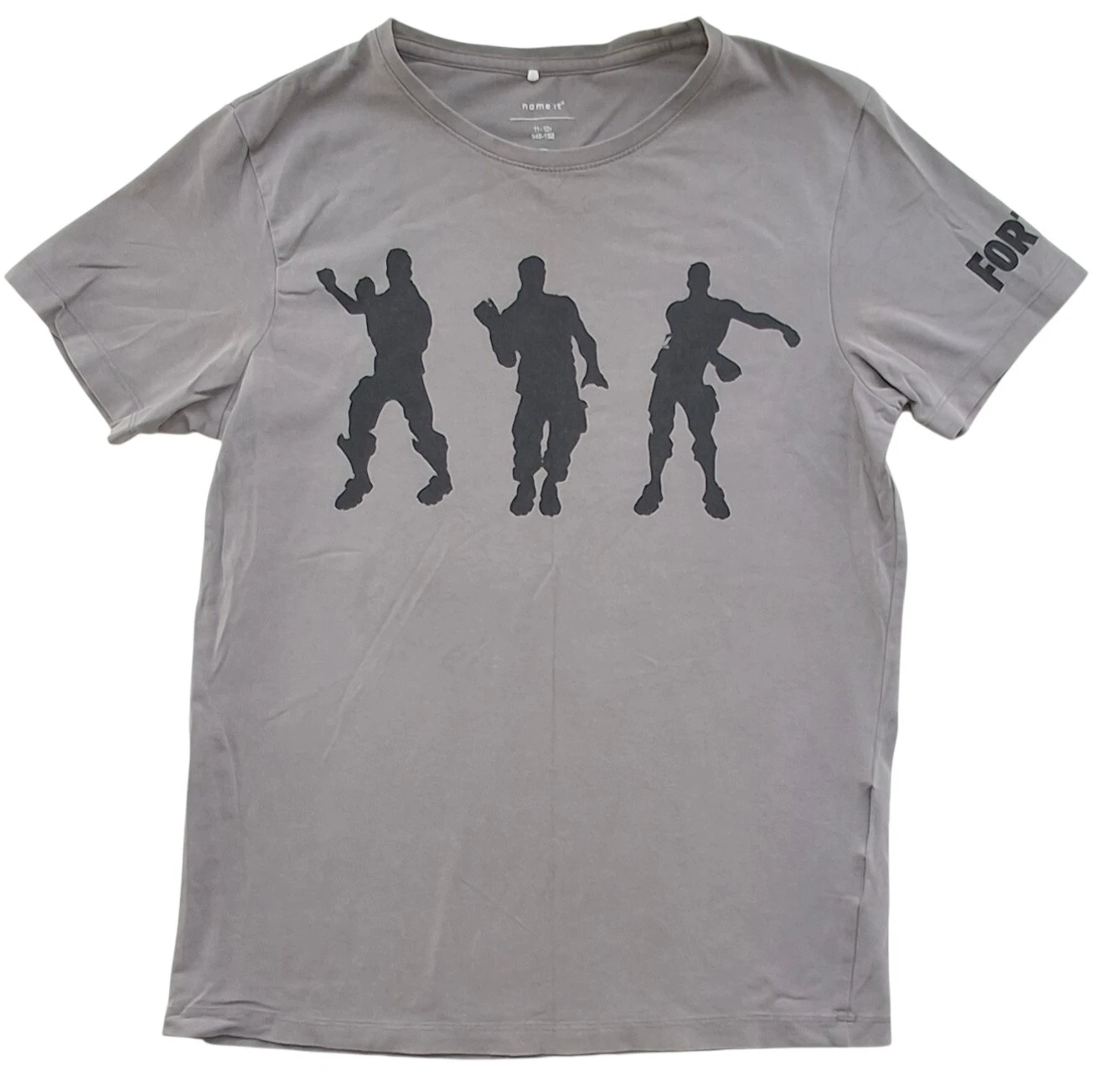 Name it grå kortærmet T-shirt str. 146-152 med Fortnight tryk på forsiden og på det ene ærme. 95% bomuld, 5% elastane.