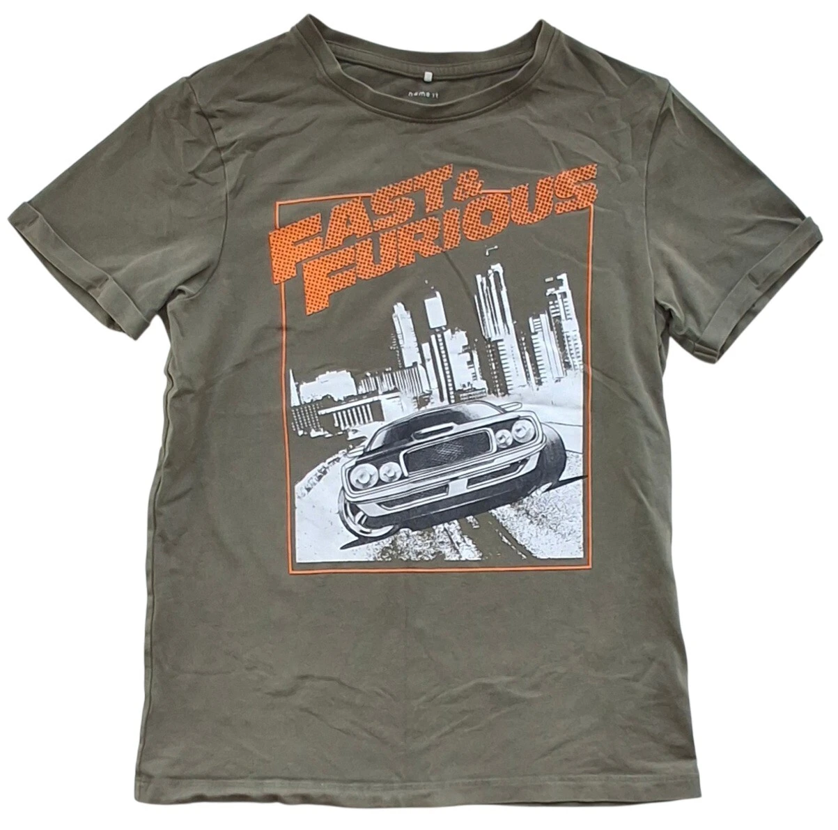 Name it grønlig kortærmet T-shirt str. 146-152 med opsmøgede kanter på ærmerne og med et fint tryk på forsiden.
