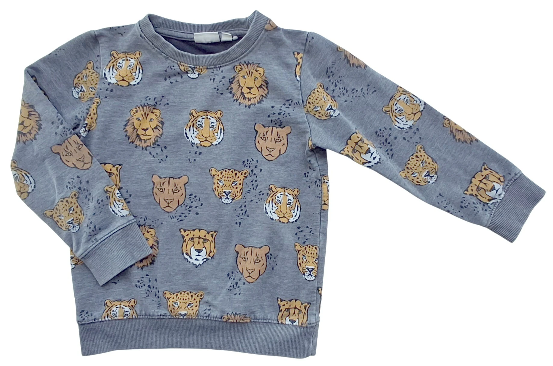 Name it langærmet grå sweatshirt str. 98 med tigerhoveder og rib kanter. 63% polyester, 32% bomuld.