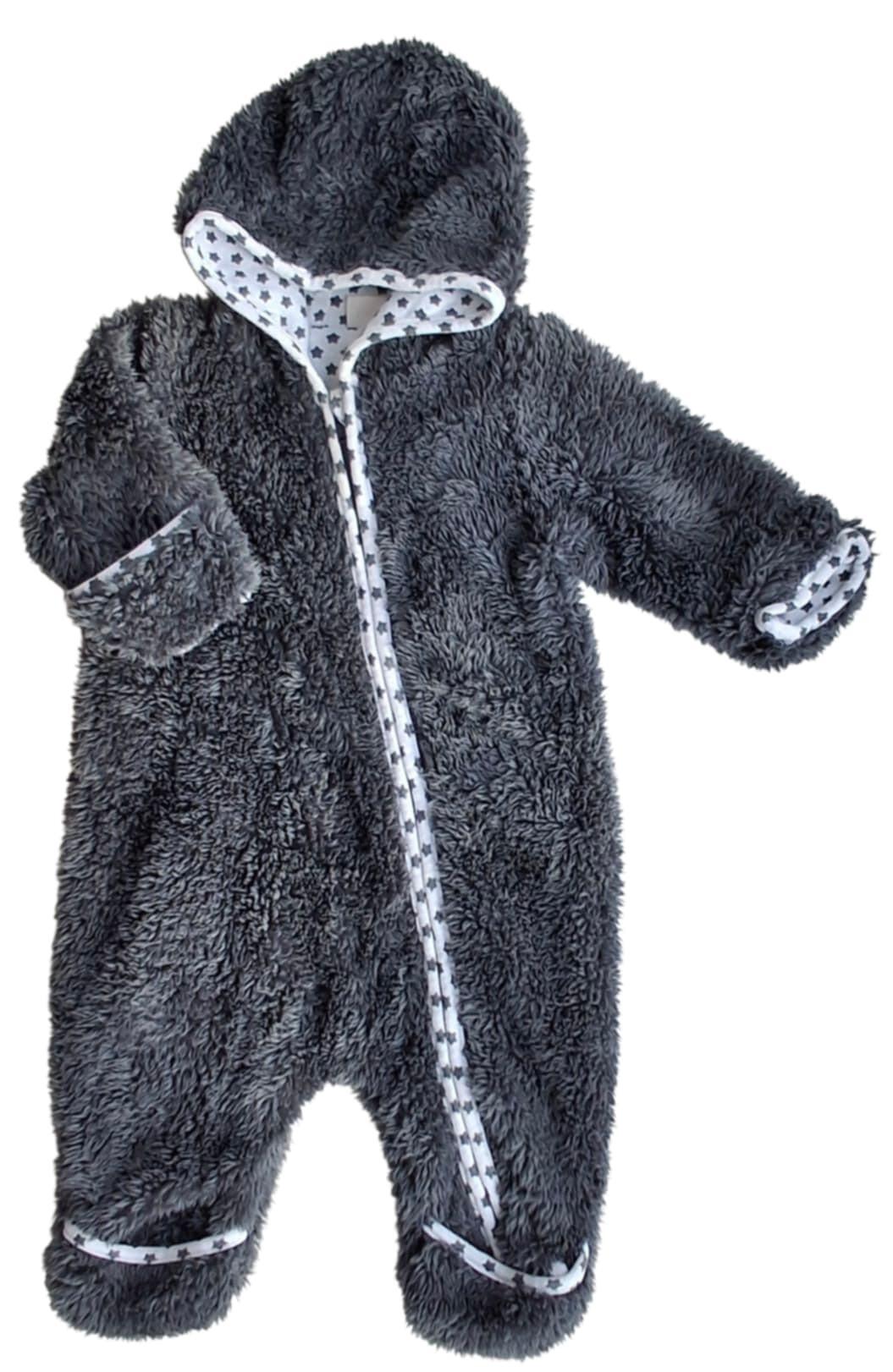 Name it mørkegrå plys heldragt str. 50-56 med ombuk ved både hænder og fødder, hætte og lynlås fra hals til fod.