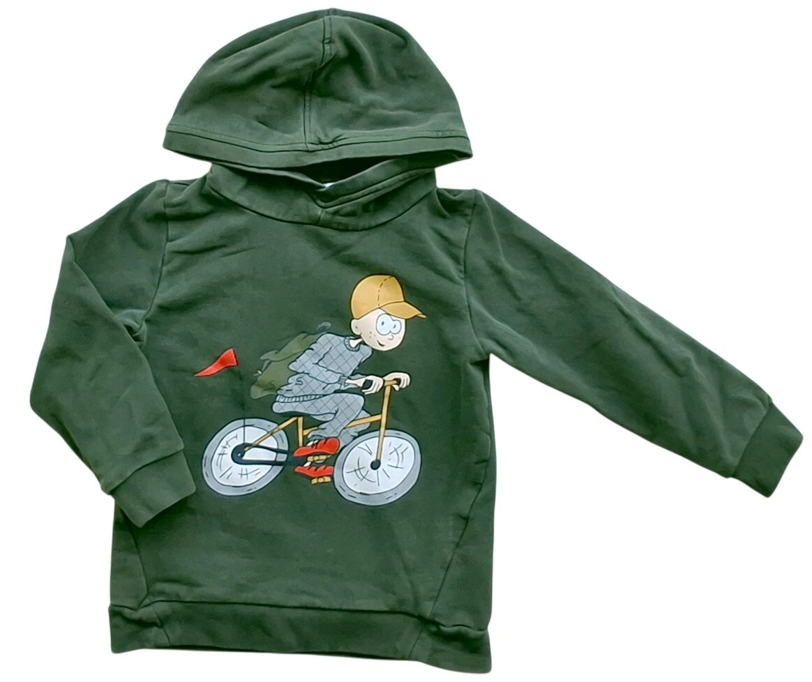 Name it mørkegrøn langærmet sweatshirt str. 98 med en hætte, rib kanter og med et fint tryk på forsiden. 95% bomuld, 5% elastane.