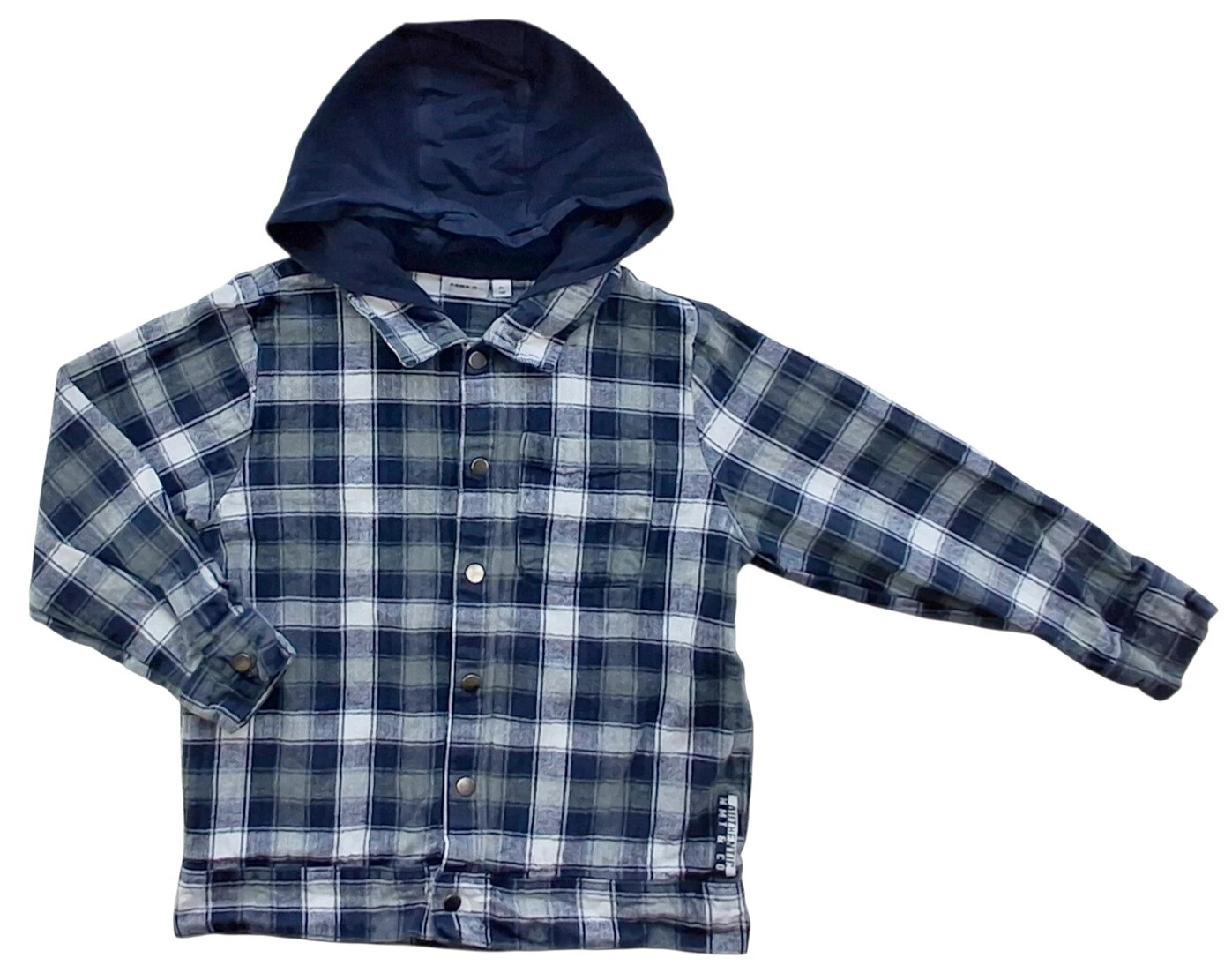 Name it tyk langærmet ternet skjortejakke str. 116 med en blød mørkeblå hætte, krave, en brystlomme og med trykknapper ned foran.