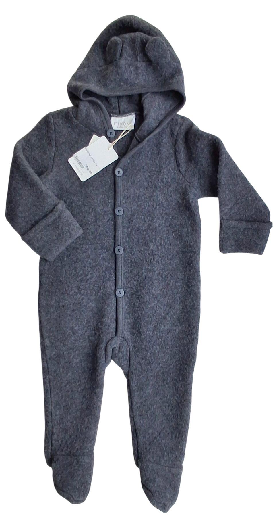 Ny Fixoni mørkegrå uld heldragt str. 74 med fødder, en hætte m. ører, ombuk ved hænderne og med knapper ned foran. 100% uld.