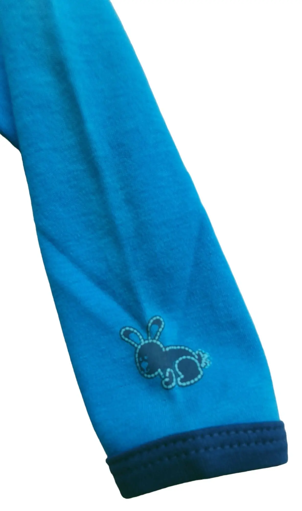 Ny Fixoni turkisblå langærmet body i en god kvalitet med mørkeblå kanter, to trykknapper på skulderen og et lille tryk nederst på det ene ærme af en kanin.