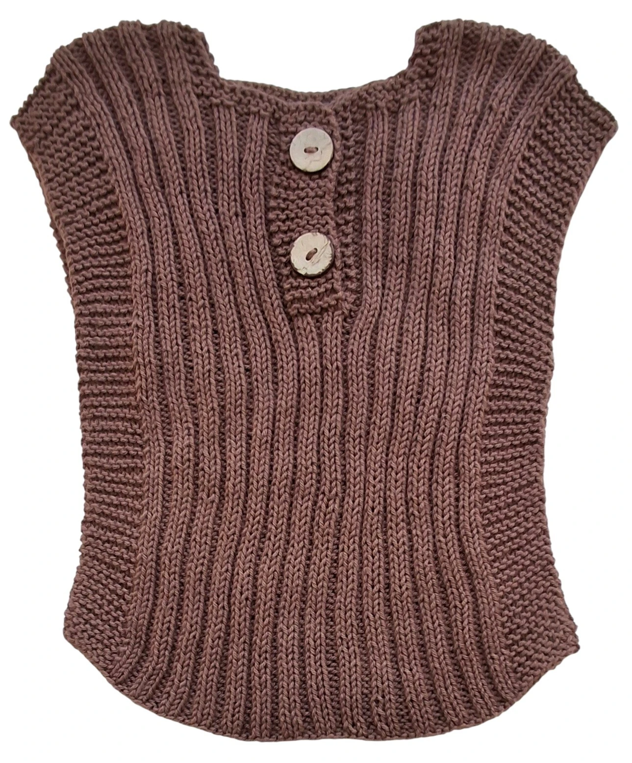 Ny hjemmestrikket blød brun rib vest str. 3-6 mdr i bomuld og med to knapper i stolpelukning.