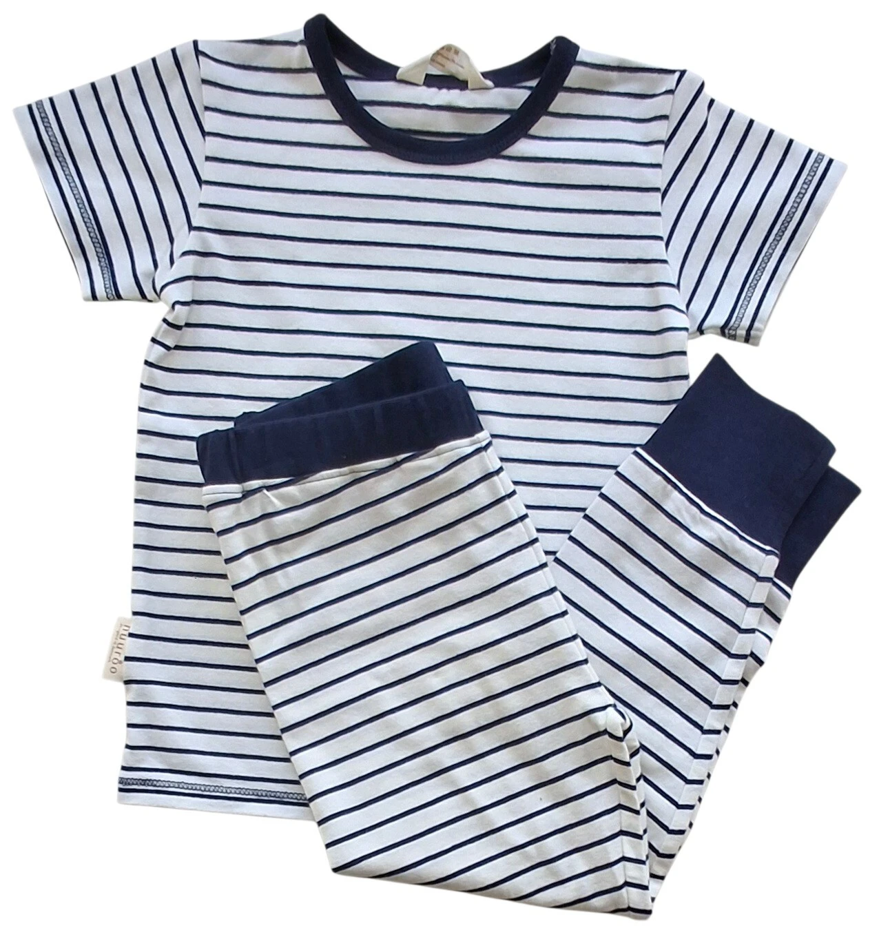 Nyt Nuuroo råhvidt blåstribet sæt str. 92 i en lækker blød kvalitet med modal. T-shirten har korte ærmer og rund elastisk kant. 100% bomuld.