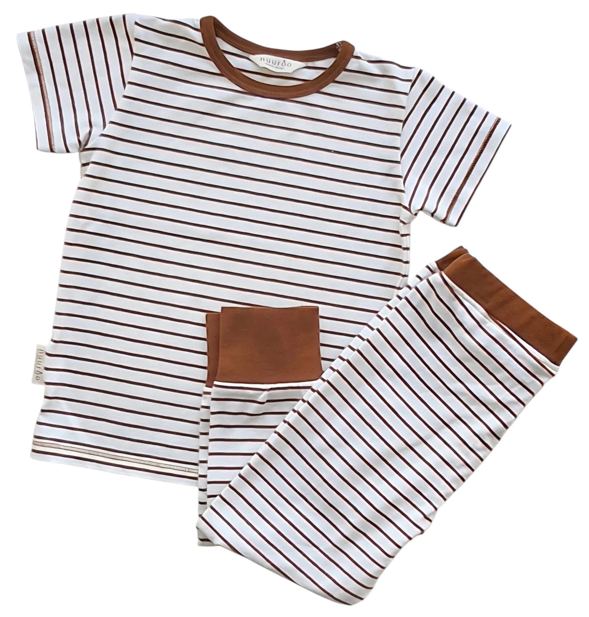 Nyt Nuuroo råhvidt brunstribet sæt str. 92 i en lækker blød kvalitet med modal. T-shirten har korte ærmer og rund elastisk kant. 100% bomuld.