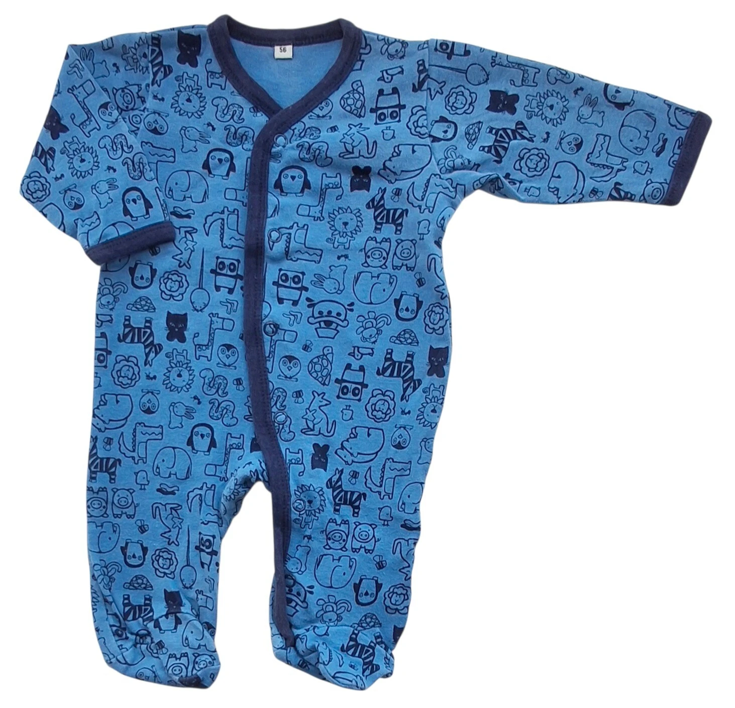 Pippi blå langærmet natdragt str. 56 med fødder tryk af dyr, mørkeblå kanter og trykknapper fra hals til fod.