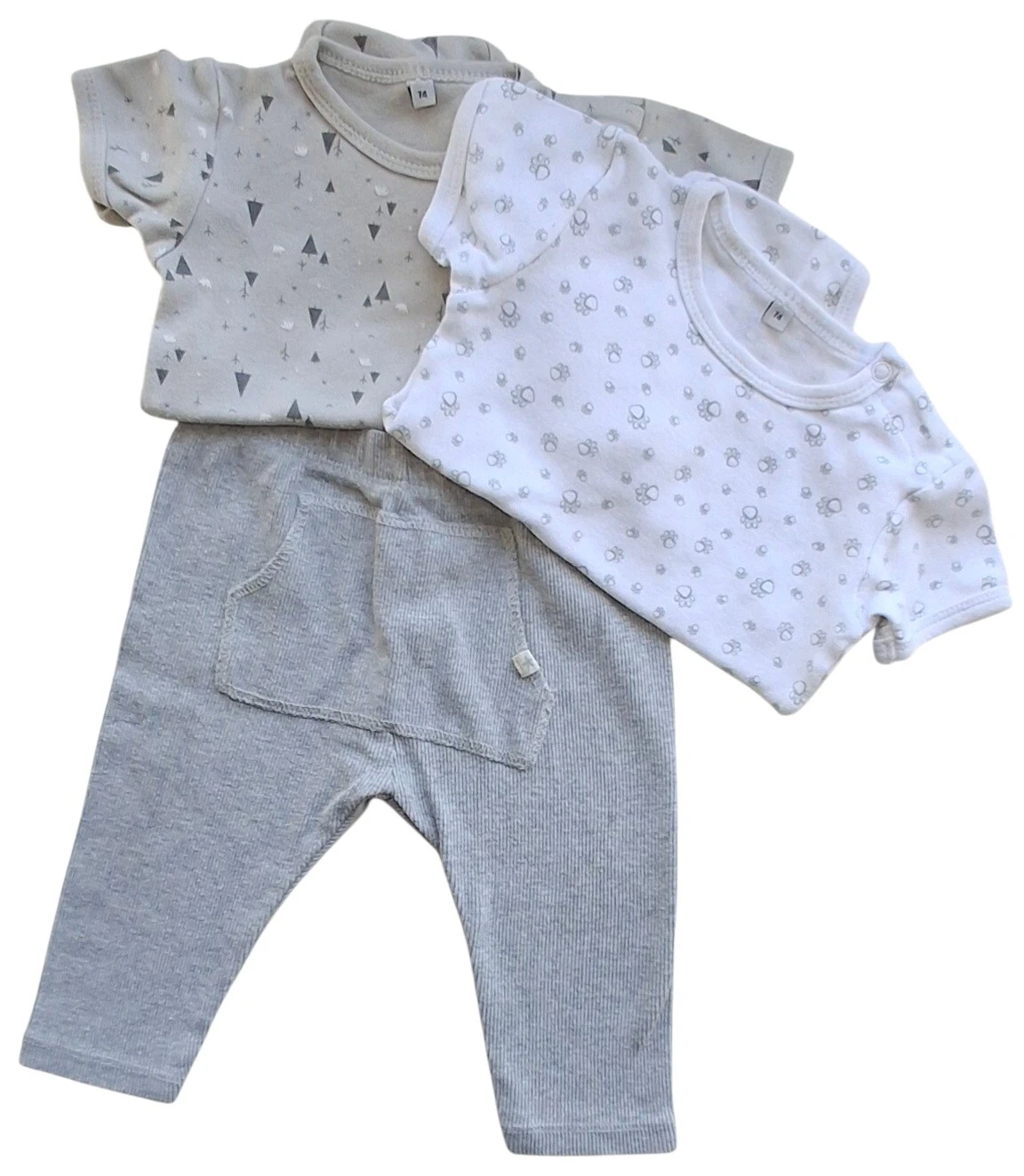 Pippi to kortærmede bodys og Zara bukser str. 74. Pippi body'erne har tryk af træer og den anden af potetryk, og de har begge to trykknapper på skulderen. Bukserne er lysegrå og i en rib kvalitet med en stor lomme på forsiden og elastik i taljen.