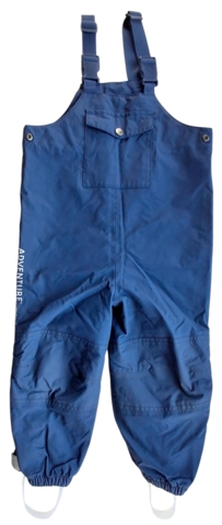Pomp de lux adventure blå overtræksbukser str. 104 med en lomme på maven, seler, elastik og lynlås i buksebenene og med fodstropper.