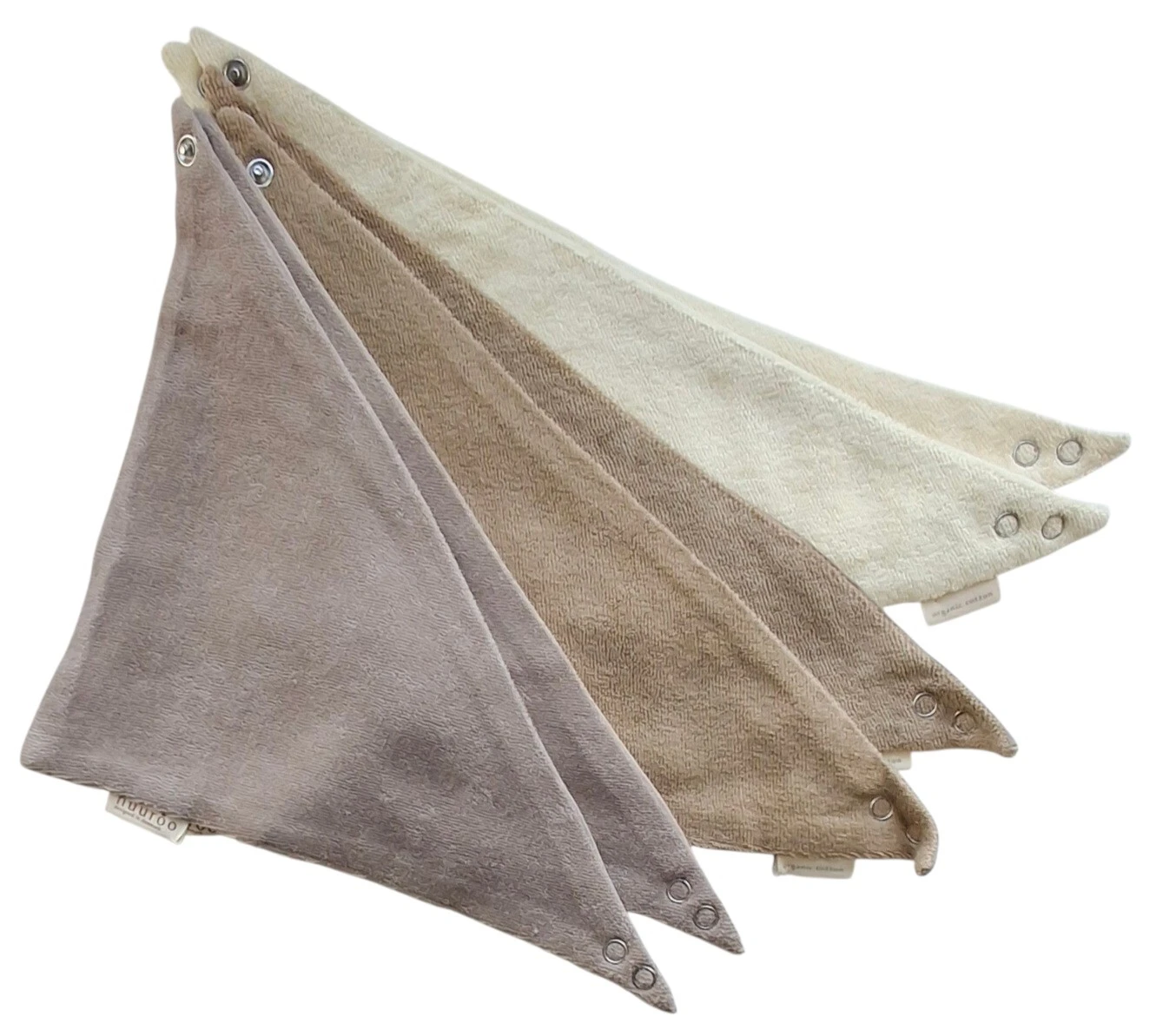 To stk nye Nuuroo savlesmækker i onesize i økologisk bomuld. Hagesmækken er vendbar med sugende frotté på den ene side og bomuld på den anden side, og med to trykknapper i nakken.
