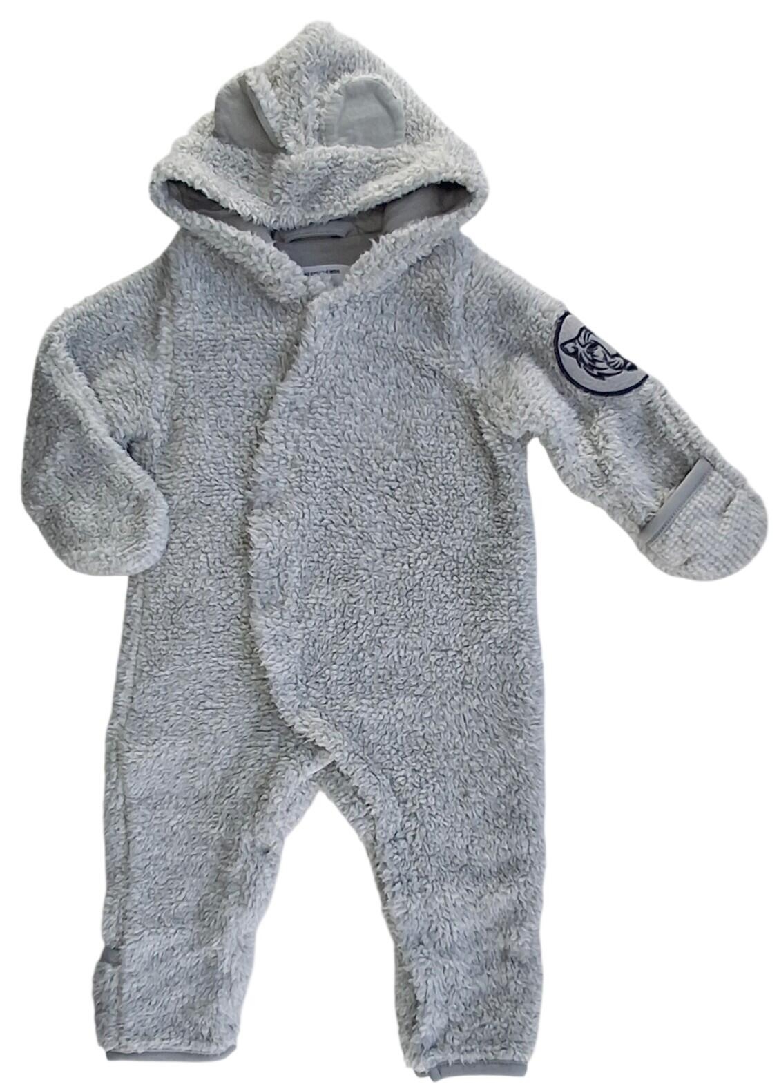 VRS lysegrå teddy køredragt str. 62 med en hætte m. ører, ombuk ved både hænder og fødder og med trykknapper fra hals til fod.